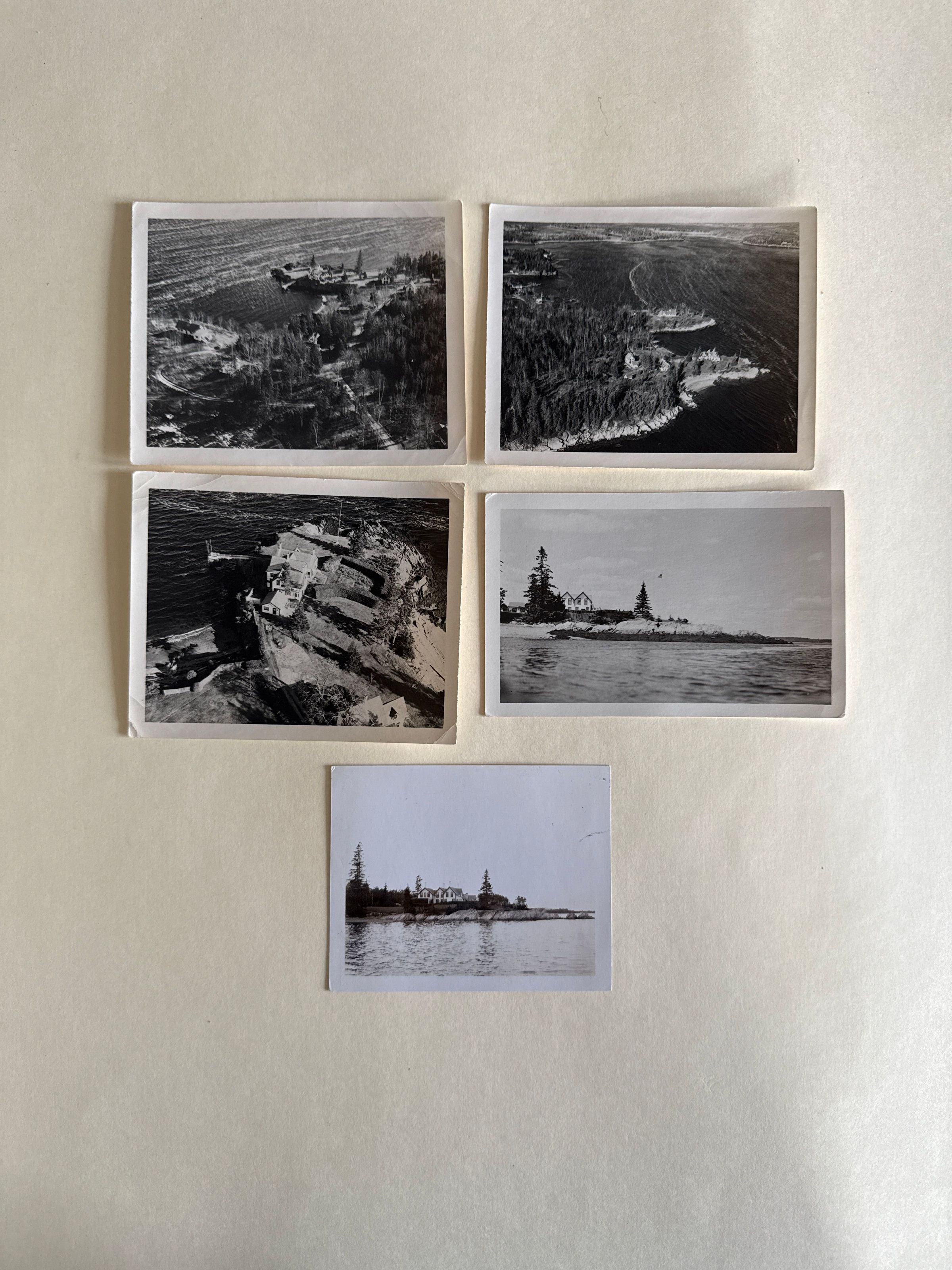 Five photographs of the same house--Bertolet, Hewes Point? Two photos from the water, and three from the air.