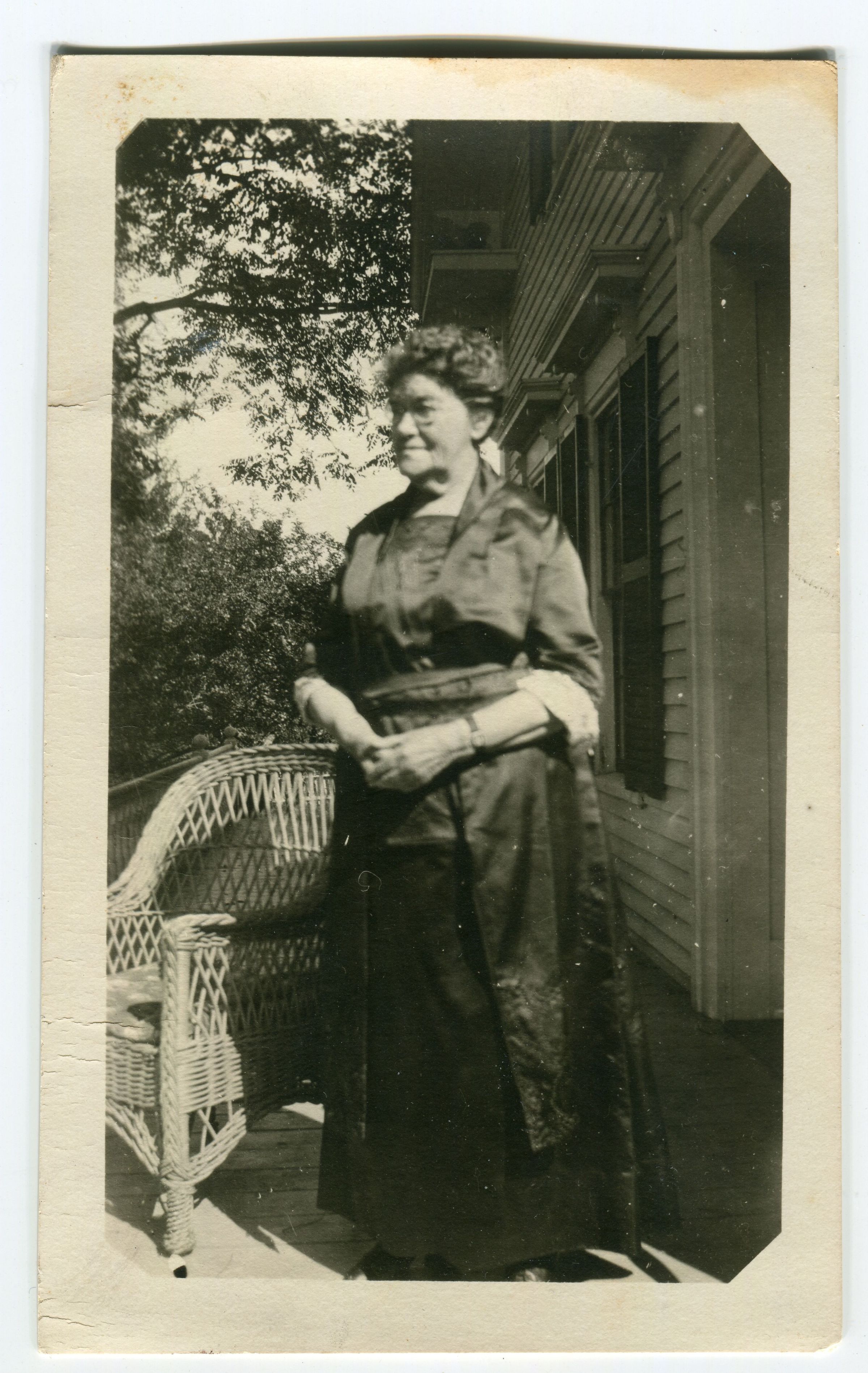 Postcard snapshot of Sabrina Seeley Brown Pendleton, Mrs Fields C Pendleton, mother of Alice L Pendleton, on the porch of her house.