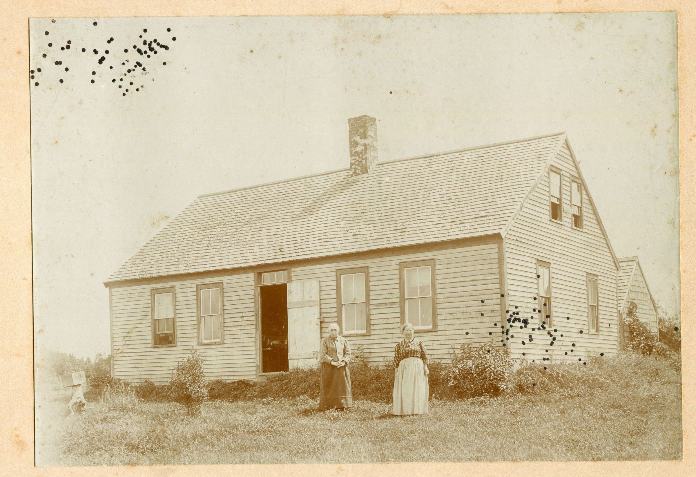 Warren House ?. Cape Cod house, simple trim, no overhang, with barn or other house in the background. On back is written "Gram Lizzie Warren" and "Warren House?" Two places on picture are spotted with ink and someone has wirtten "That old irish woman that stands abrest of the rain drain has just come out of the belack bery bushes."