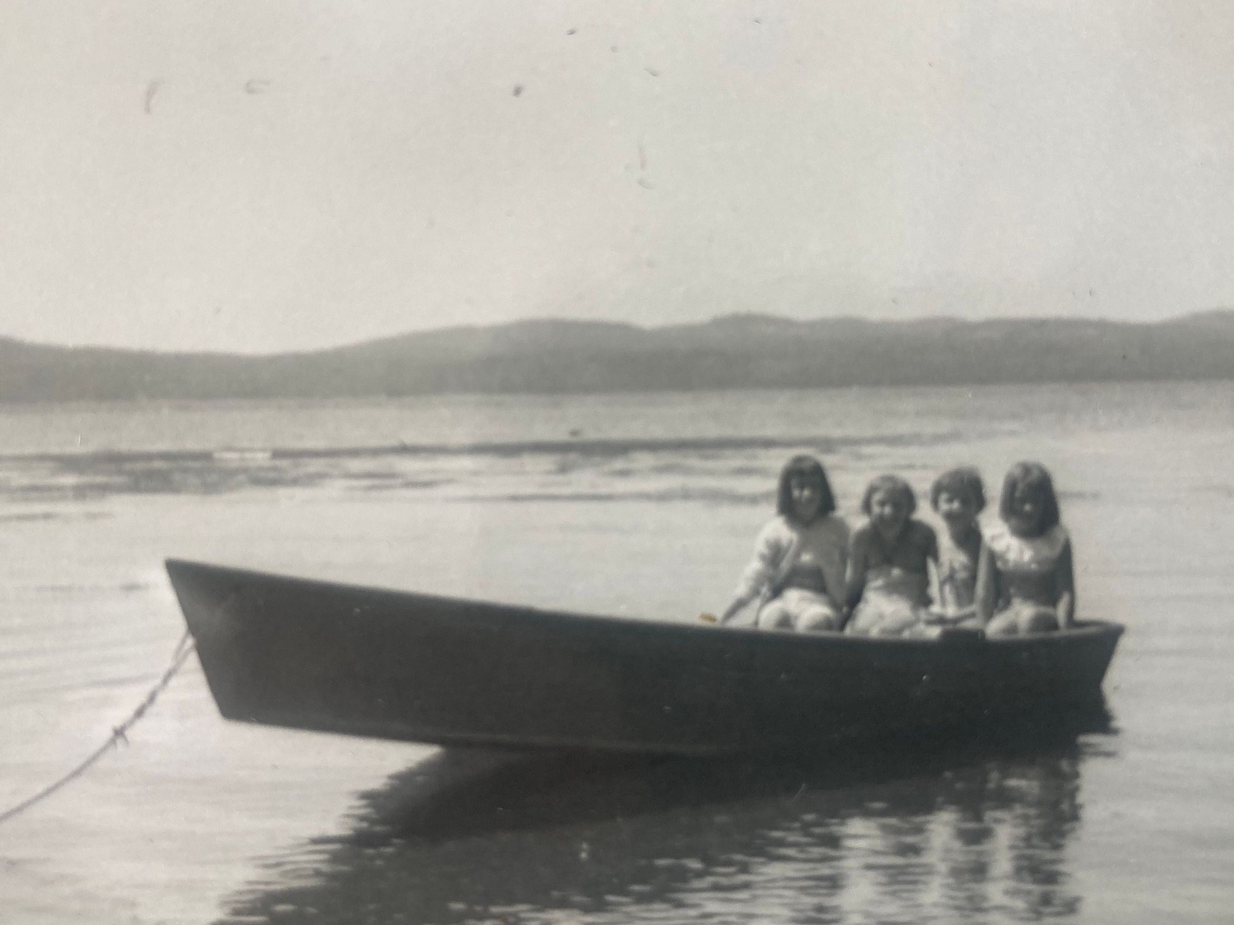 Vacation photographs featuring the same young woman in plaid skirted bathing suit, short haircut--along with a male companion and an older man and woman.