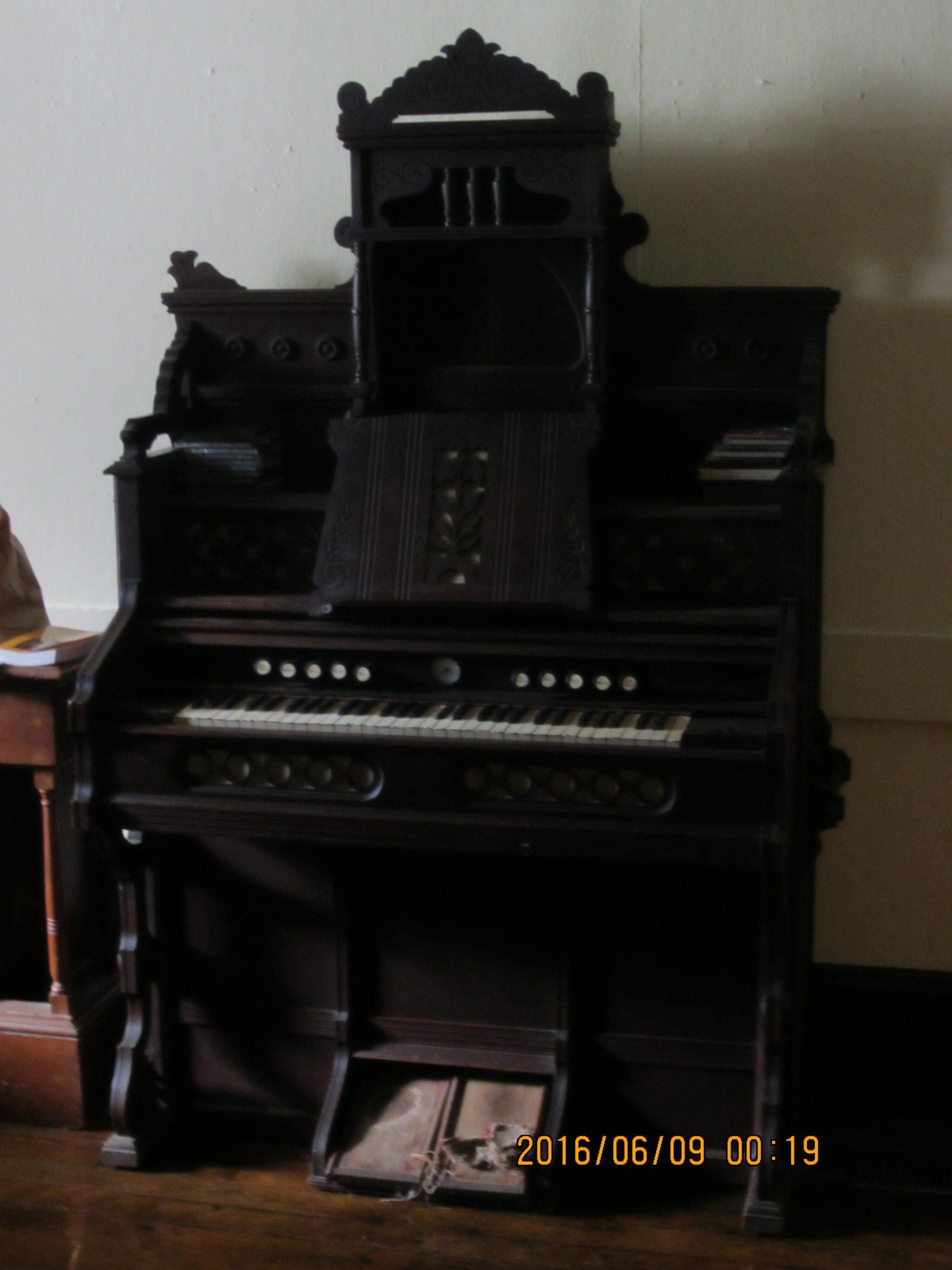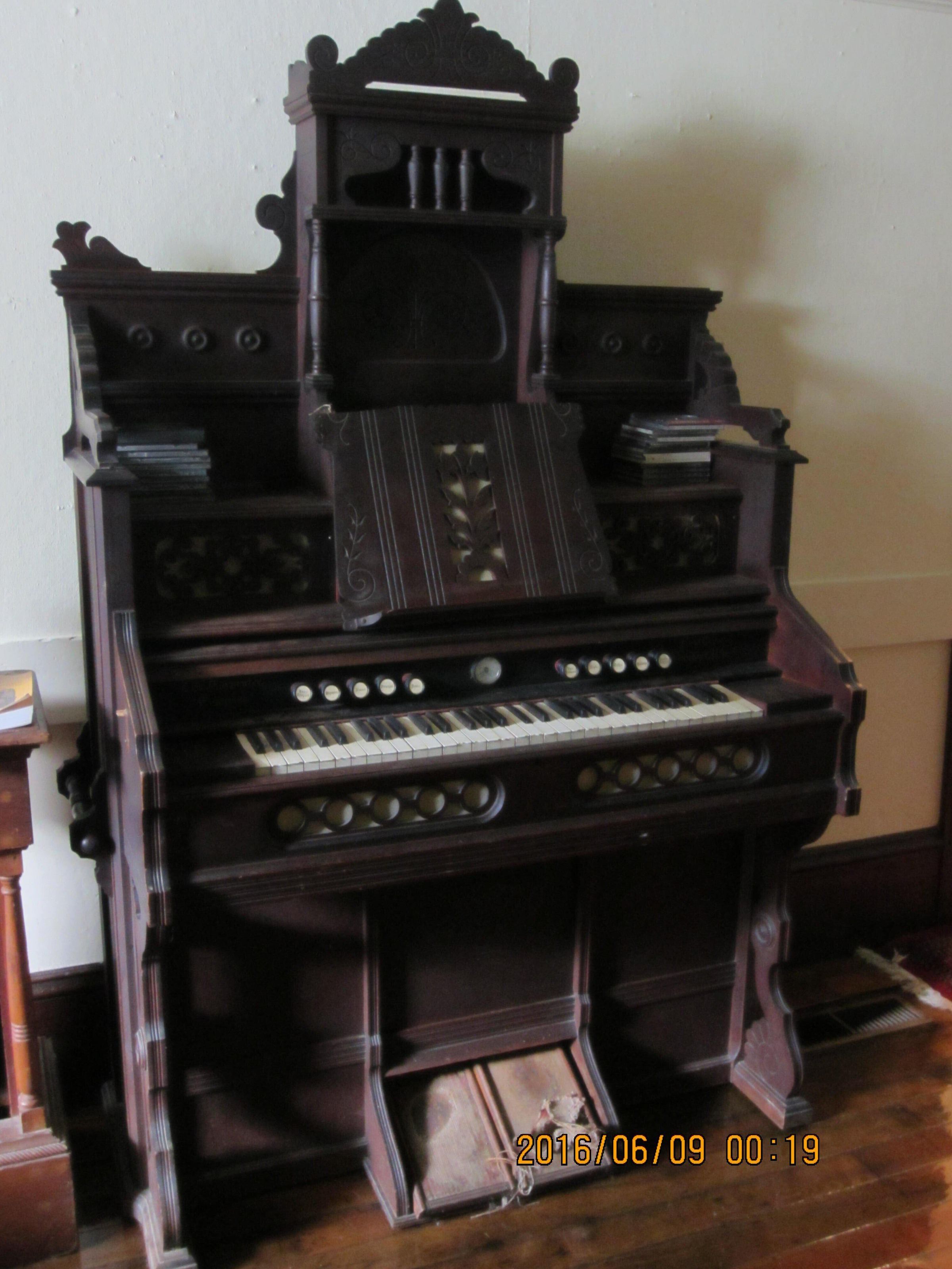 Reed organ, given by the Reidy family, once in their Islesboro home. Full keyboard with 10 stops. Tone is produced by two bellows, one evacuated by a pair of foot pedals thus creating a vacuum in the second bellows which can then pull air through a reed when a key is depressed.
