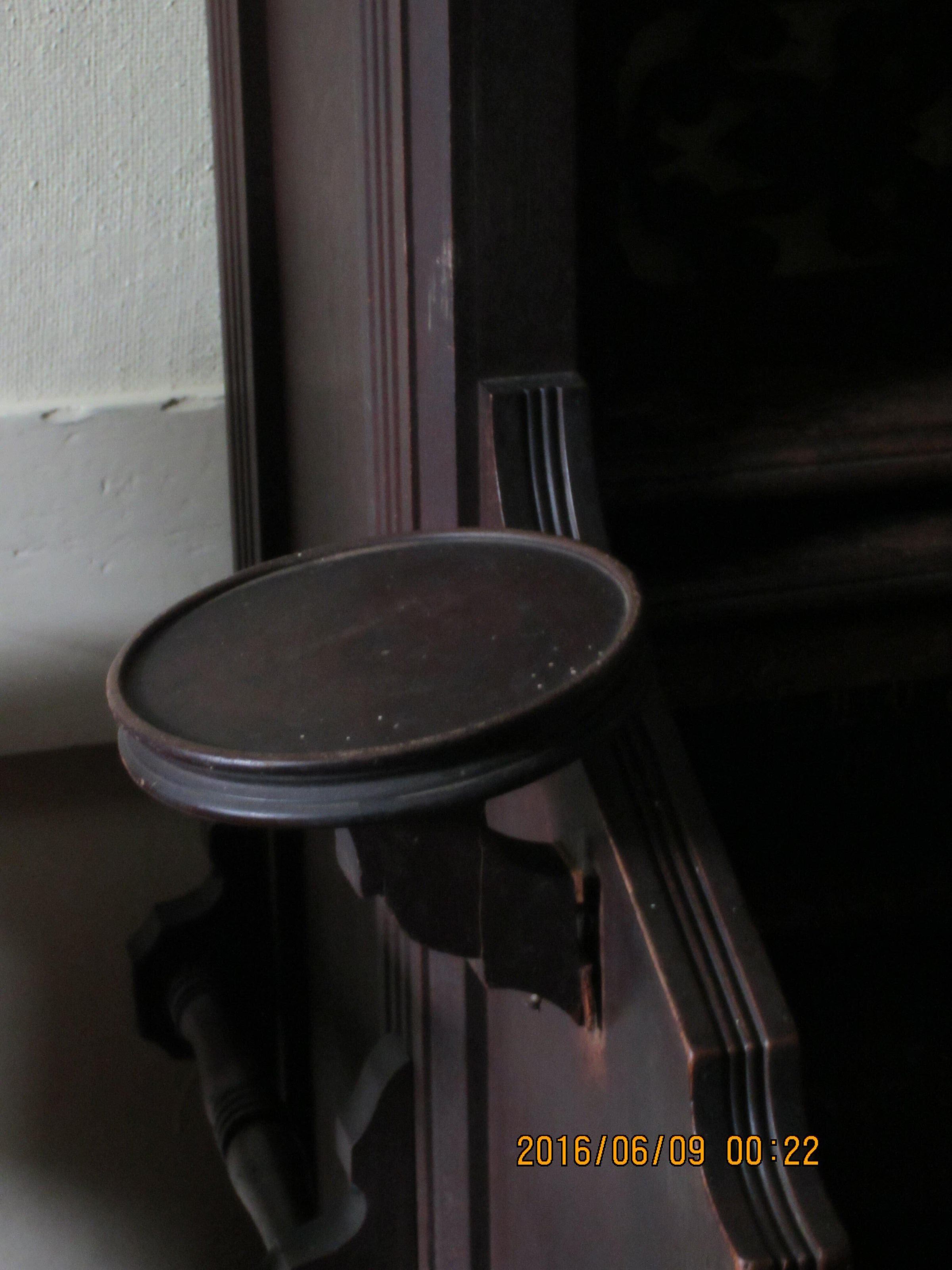 Candle/lamp holder brackets for the Reidy reed organ in Pendleton Hall., one for each side of keyboard. May be reattached when organ is finally settled.