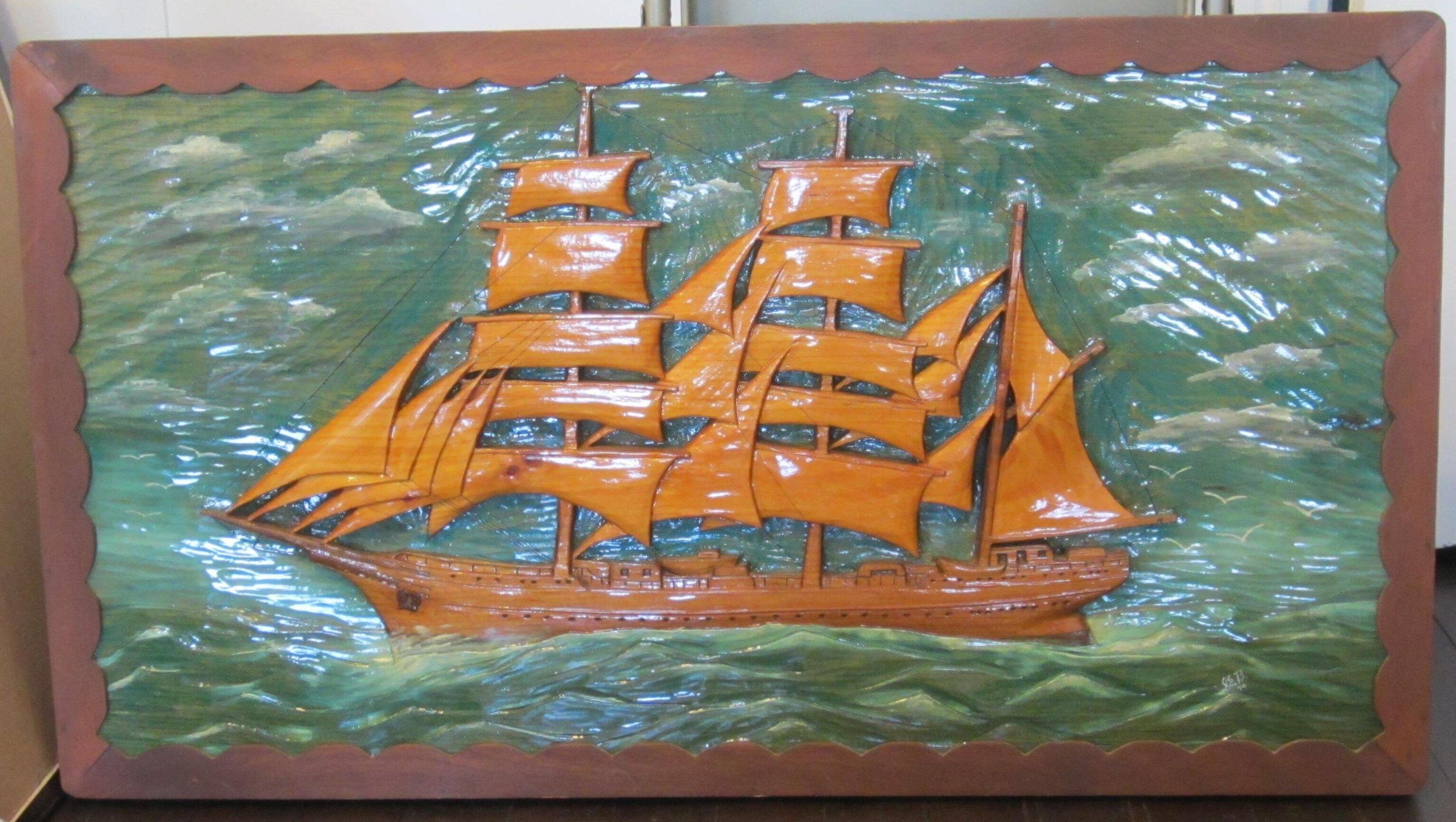 Bas Relief wood carving 42" x 24" x 2" showing a full-rigged Brig under full sail (jibs, jiggers, top gallants etc), natural wood color for ship and sails, sea painted green, all with high gloss varnish. Framed in 2" wood with scalloped edge, which was added by Stanley's brother Jacob "Buddy" Bethune. Solid, heavy.