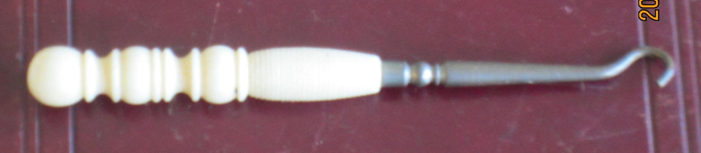 Buttonhook with ivory or bone handle and metal hook, 3.25" long overall, turned grooves on the bone/ivory. This tool was principally used to button the many tiny buttons on ladies boots, but also for some dress buttons.
