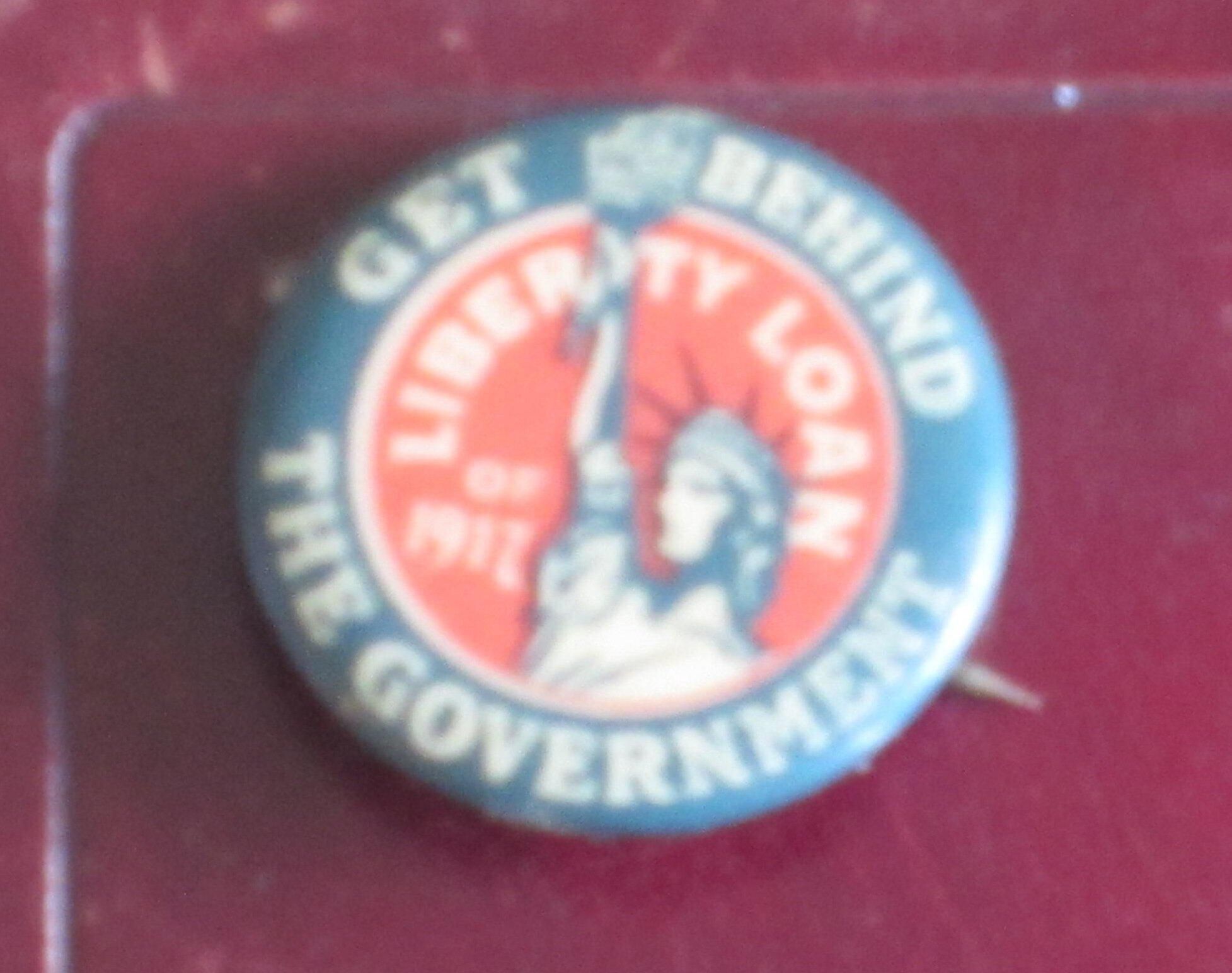 7/8" button for government campaign to sell Liberty Loans to finance WW1. Red center shows statue of Liberty with words "Liberty Loan of 1917"; green border highlights words "GET BEHIND THE GOVERNMENT".