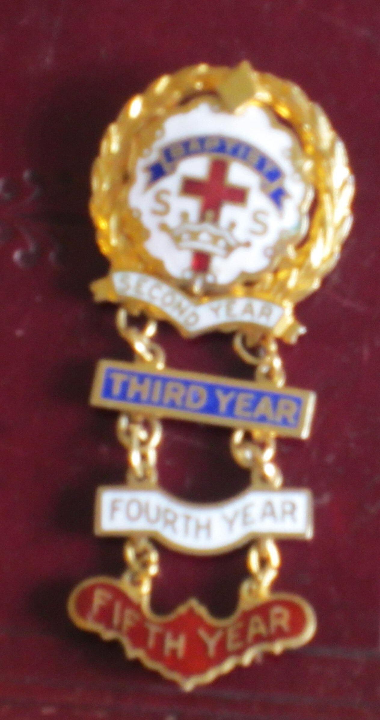 Medal for Baptist Sunday School attendance, presumably for first and second years, with added bits for Third, Fourth, and Fifth Years. Shiny metal with enamel design in white, red (the Cross) and blue. Overall length 2.5", width 1"