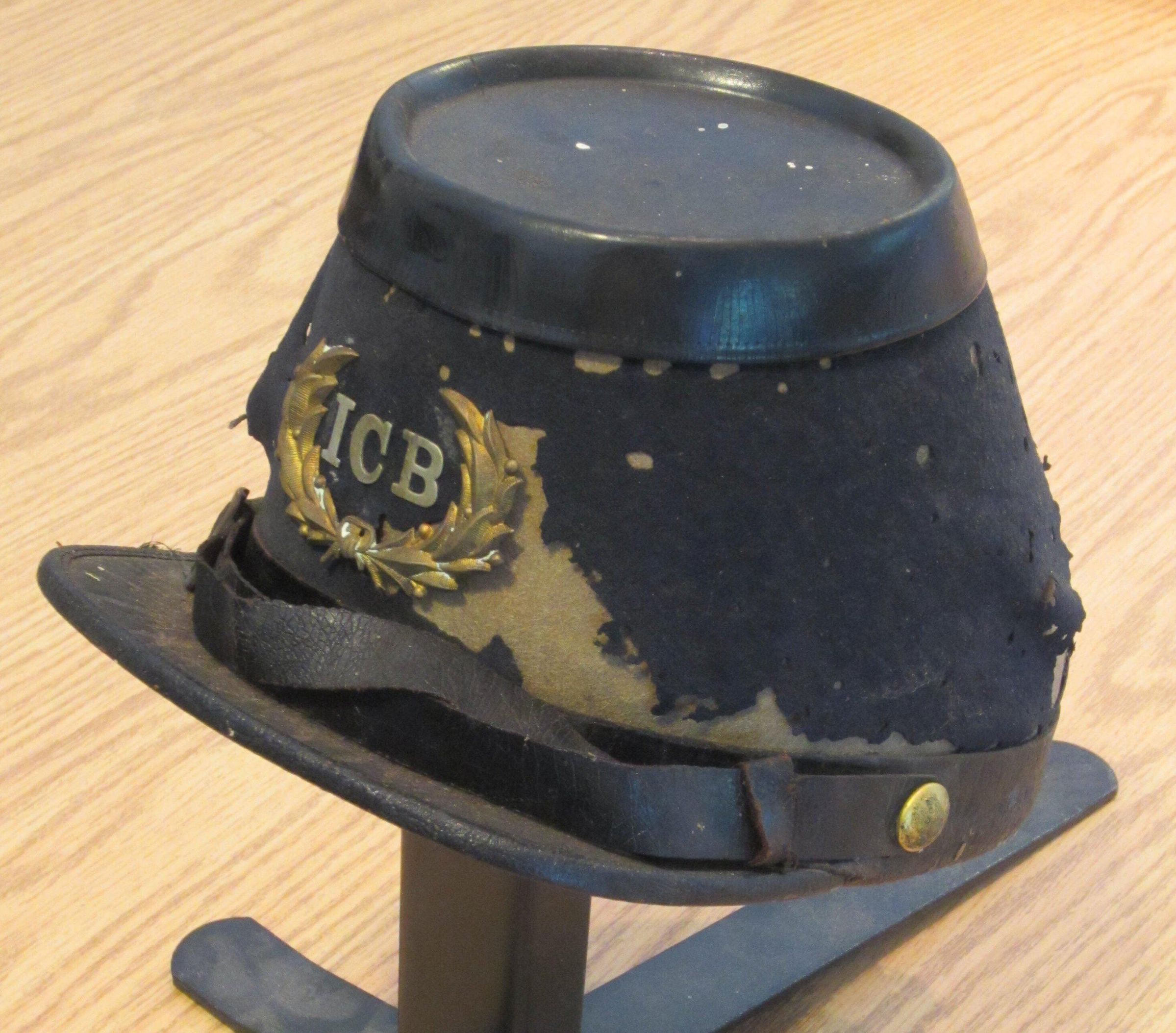 Cap that belonged to Fernald Fairfield's great-grandfather. Shape like a 19th c military cap, all black, molded with black felt cover, leather sweatband, small gilt buttons holding the leather adjustment band, small black visor. Letters ICB inside a laurel wreath decorate the front.