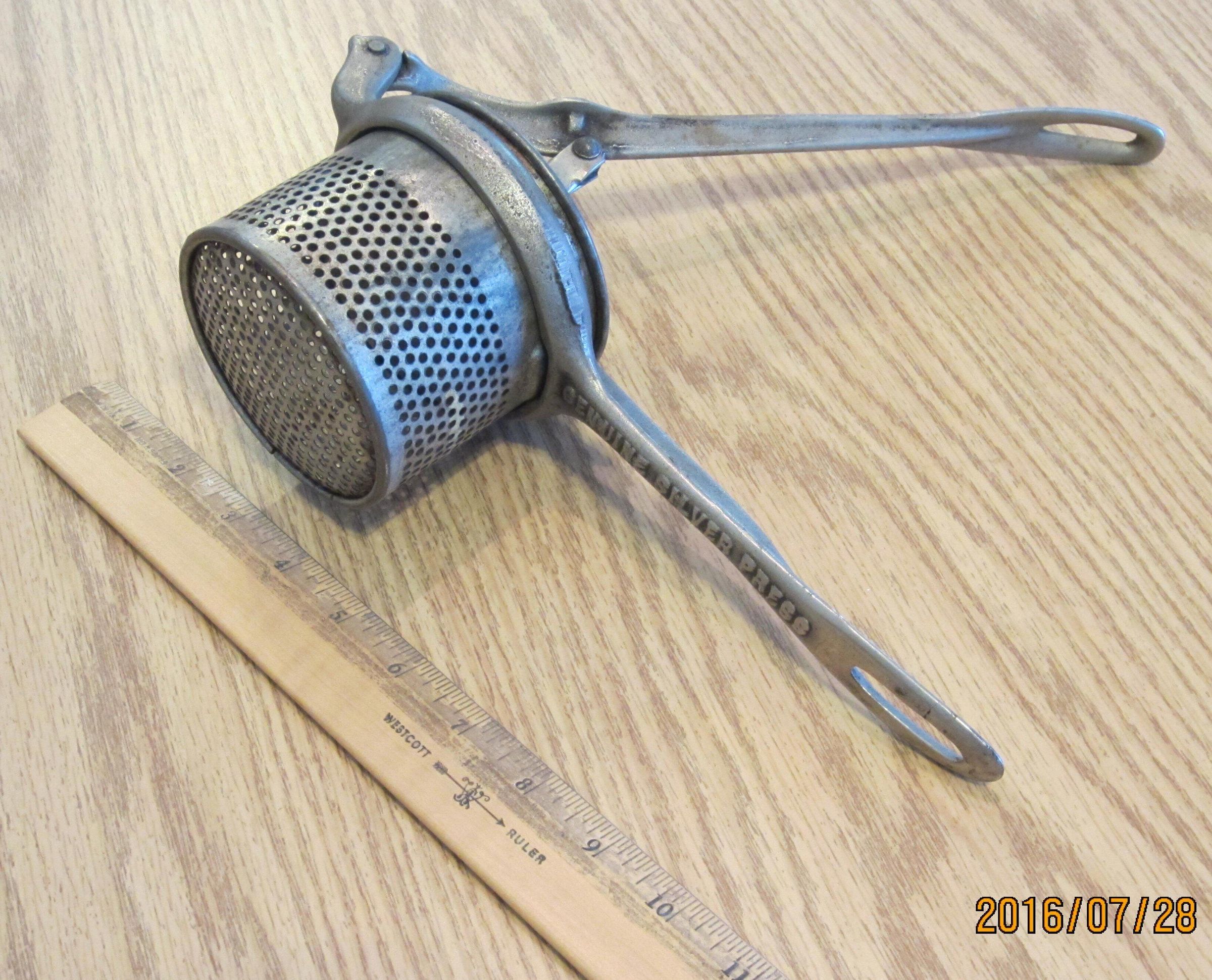 Metal press to process boiled potato by "ricing," squeezing the cooked potato into small "grains" comparable to rice, a sort of upscale mashed potato. Replaced by electric food processors. This one made by Silver & Co, NY , and labelled "Genuine Silver Press."