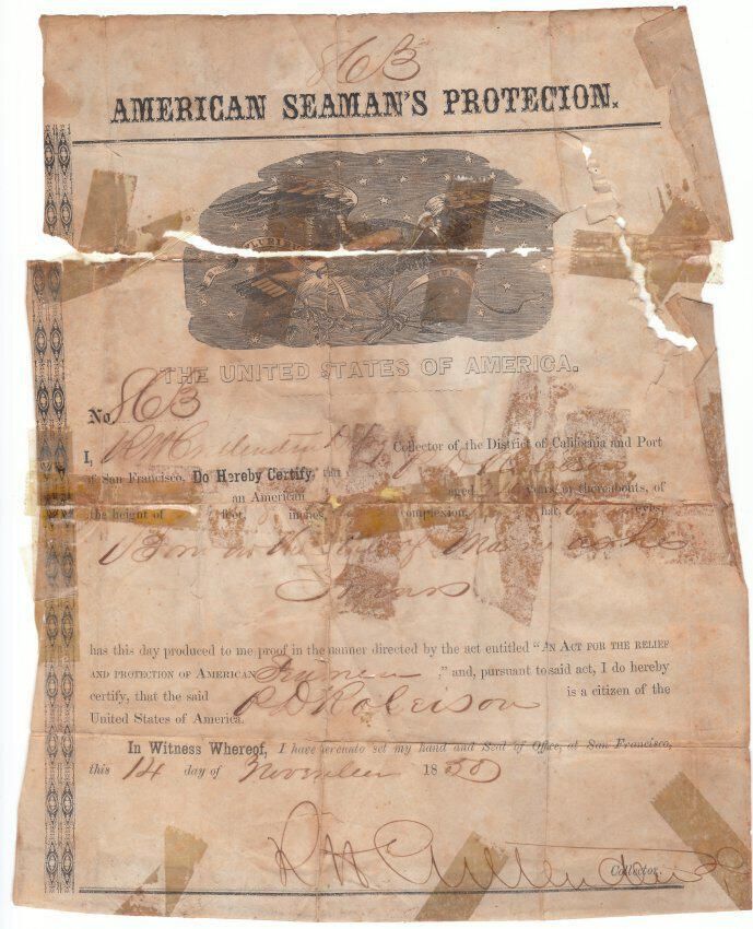 8x10" paper attesting to citizenship of P D Rolerson under the Act for the Relief and Protection of American Seamen. At top "American Seaman's Protection" with picture of the U S eagle; No. 863, signed by R H Crittenden, Deputy Collector of the District of California and Port of San Francisco, November 14, 1858. Is "P D Rolerson" the father of Phineas Leslie Rolerson (Farrow, p. 271)?