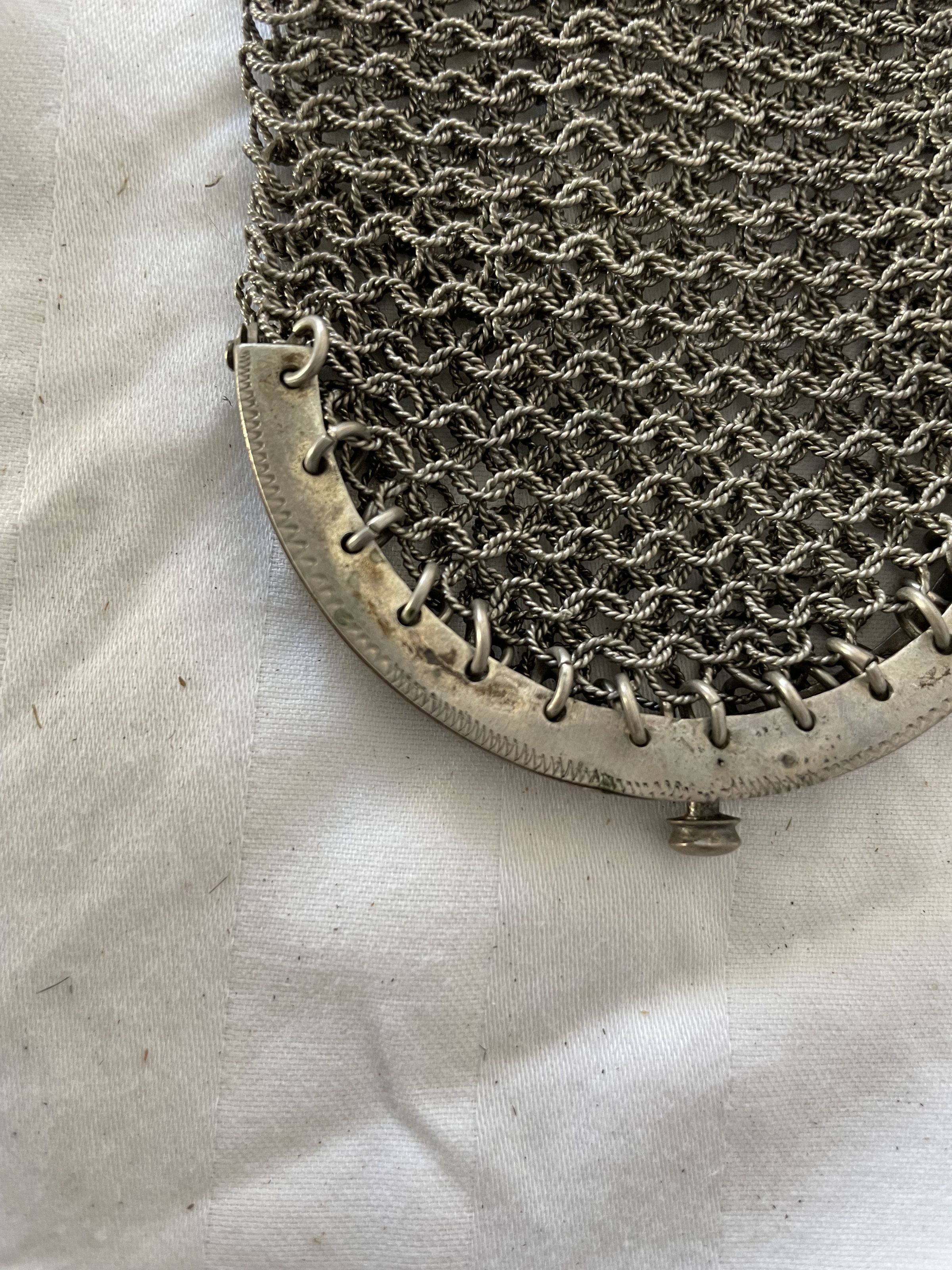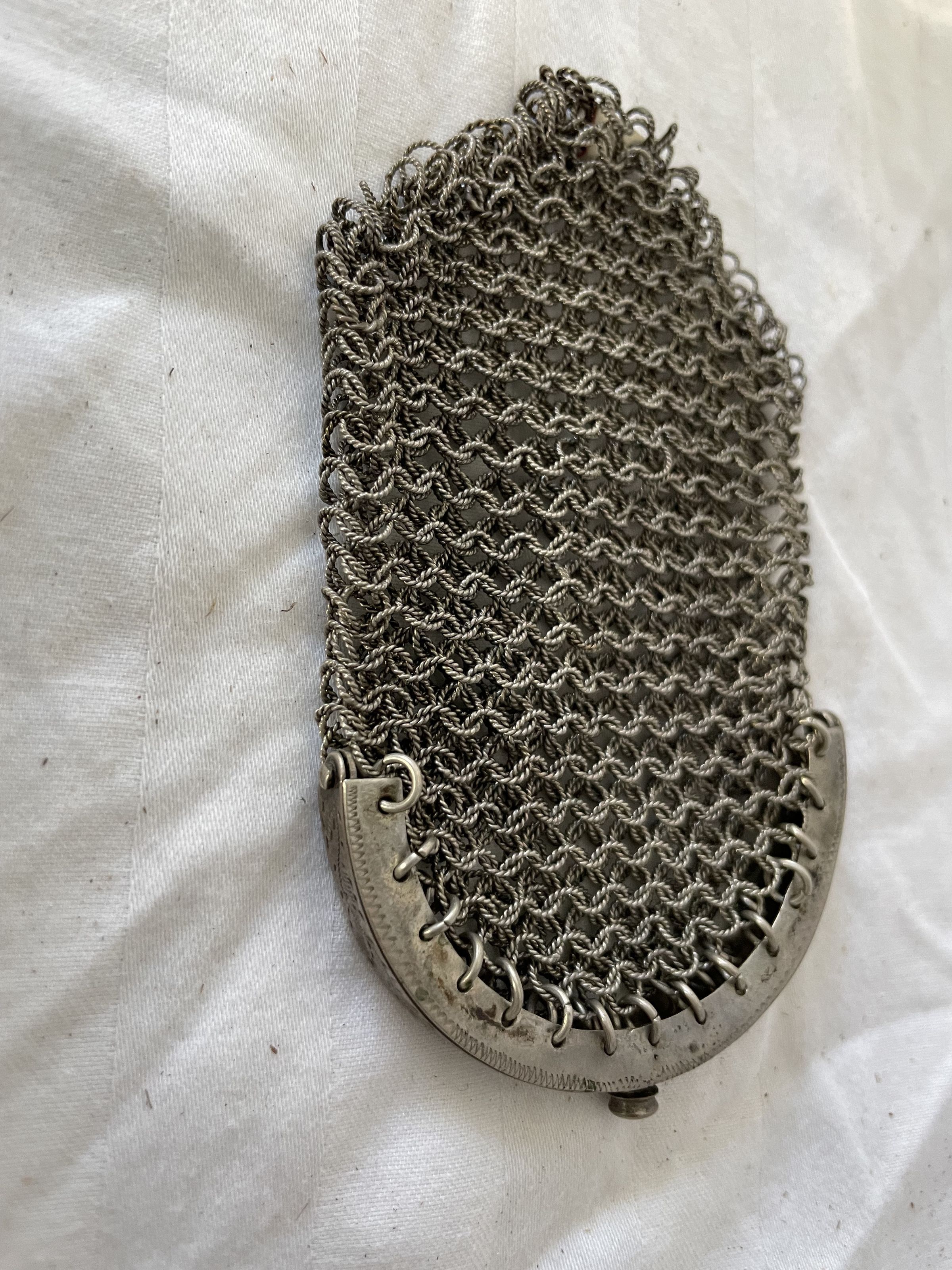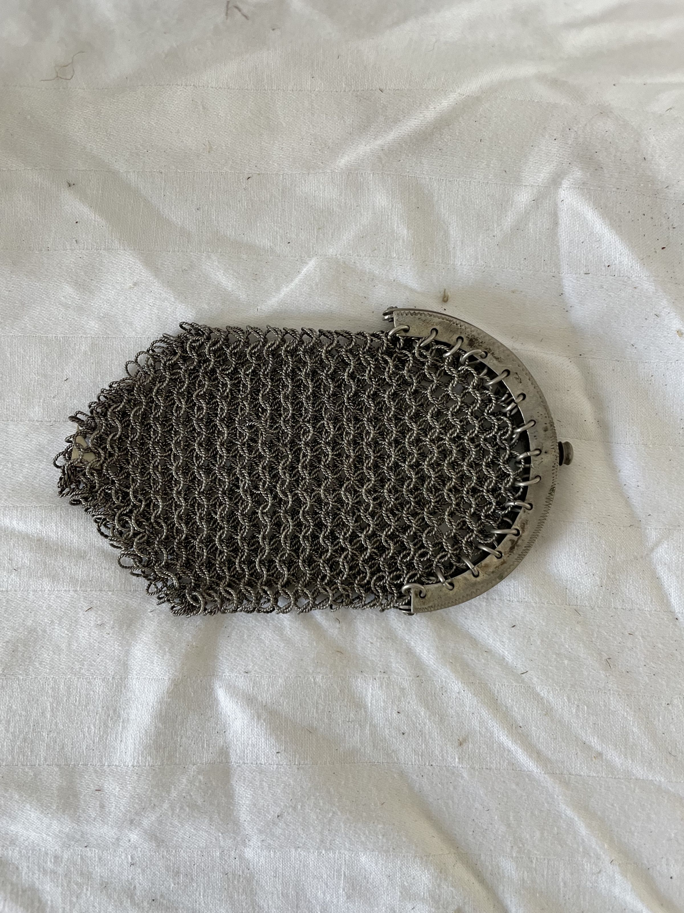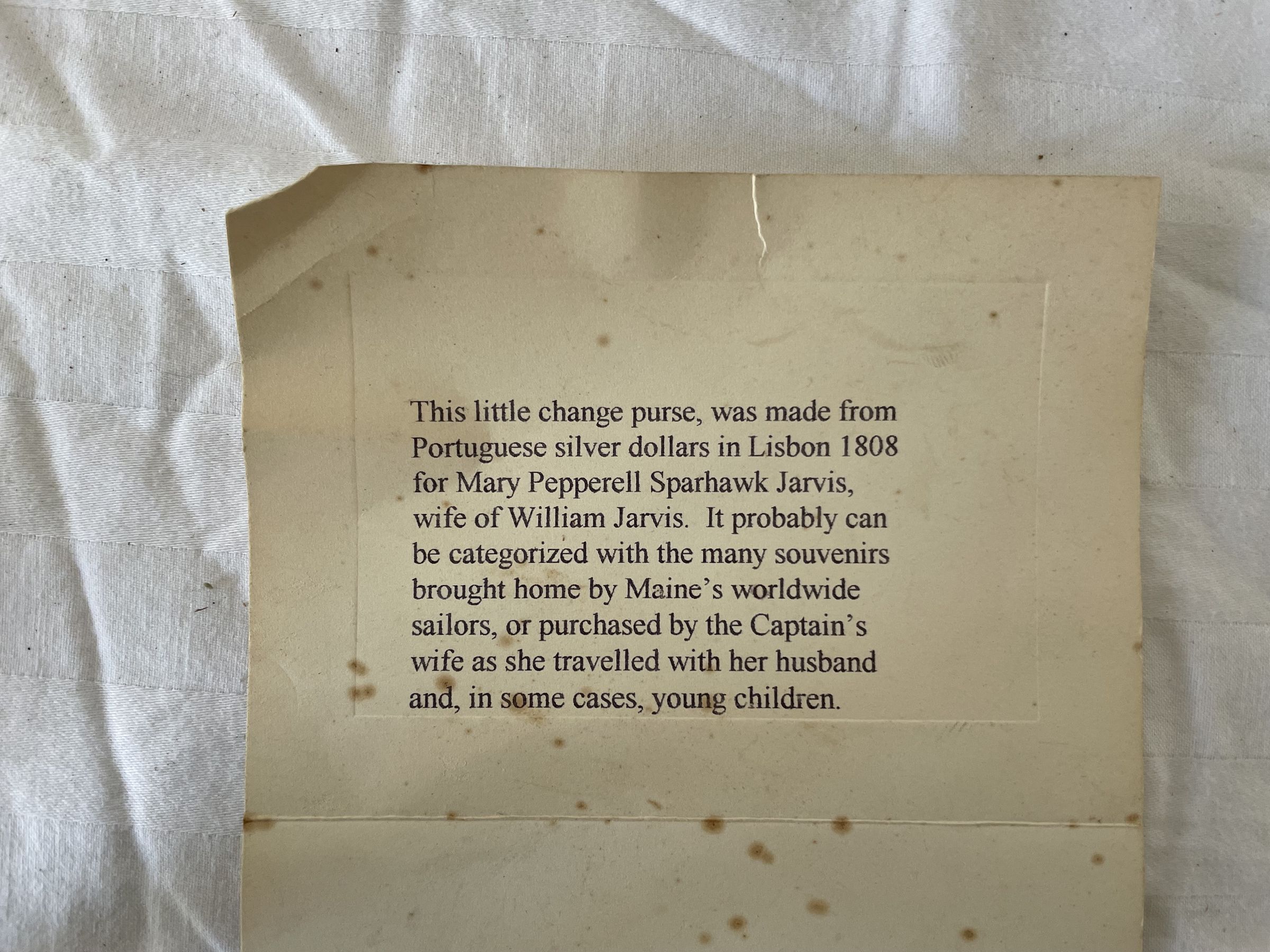 Small silver linked chain coin purse. The purse is clasped with a pin connected to an arched metal strip. The label with it reads: "This little change purse was made from Portuguese Silver Dollars n Lisbon in 1808 for Mary Pepperell Sparhawk Jarvis, wife of William Jarvis. It probably can categorized with many souvenirs brought home by Maine's worldwide sailors, or purchased by the captain's wife as she travelled with her husband, and, in some cases, young children.