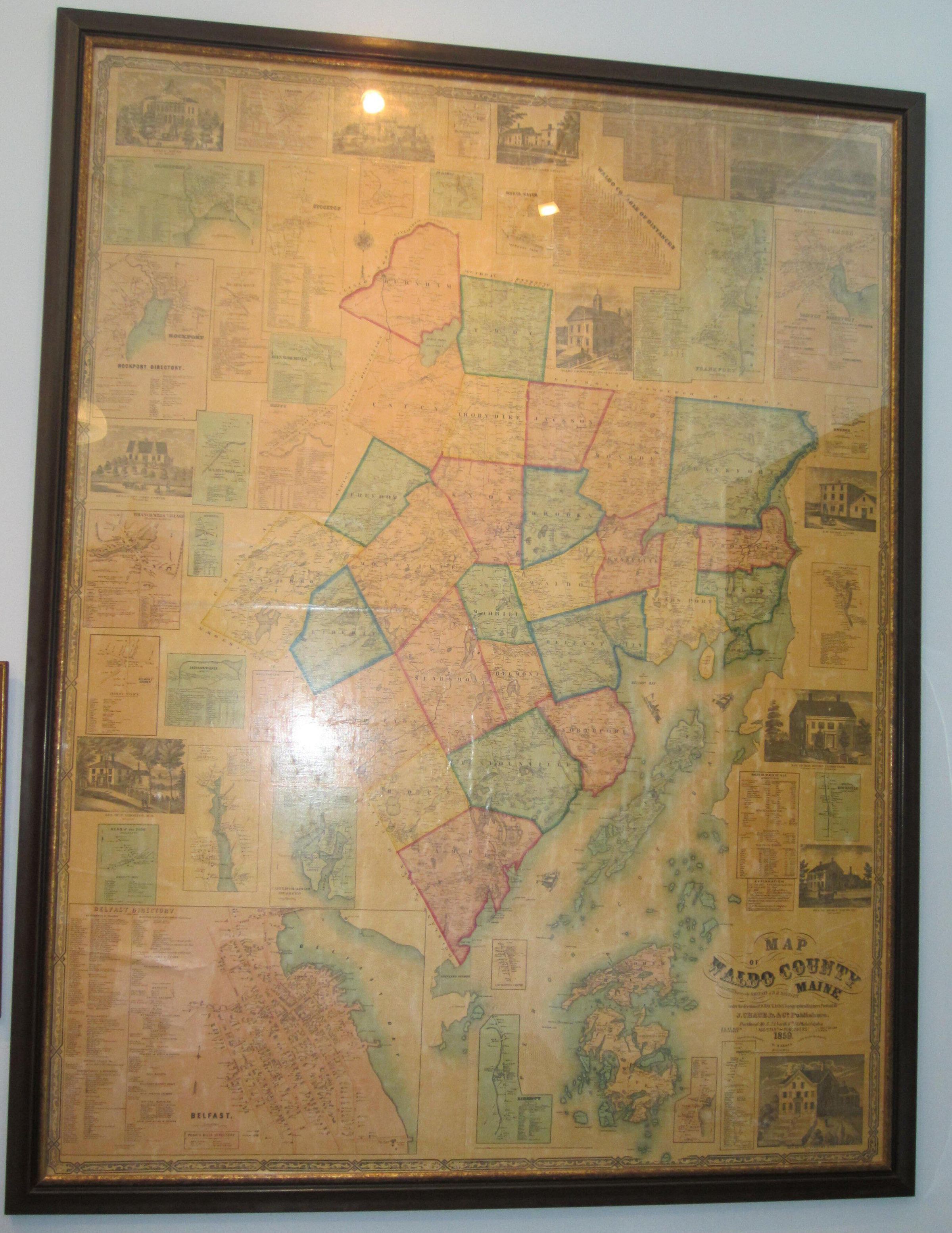 1859 wall map of Waldo County c. 4x6' with hanging rod. A similar map dated 1850 is 1111.764.0001 which is being used to restore this copy. Bud Mitchell, donor, found this map in the attic of his home in Dark Harbor, Derby Road, and presumes the house and the map were property of Capt. Oliver Brown, the original owner/builder of the house. Another copy is in the Registry of Deeds office in Belfast, and yet another copy, framed, hangs in the foyer of a restaurant in Belfast.