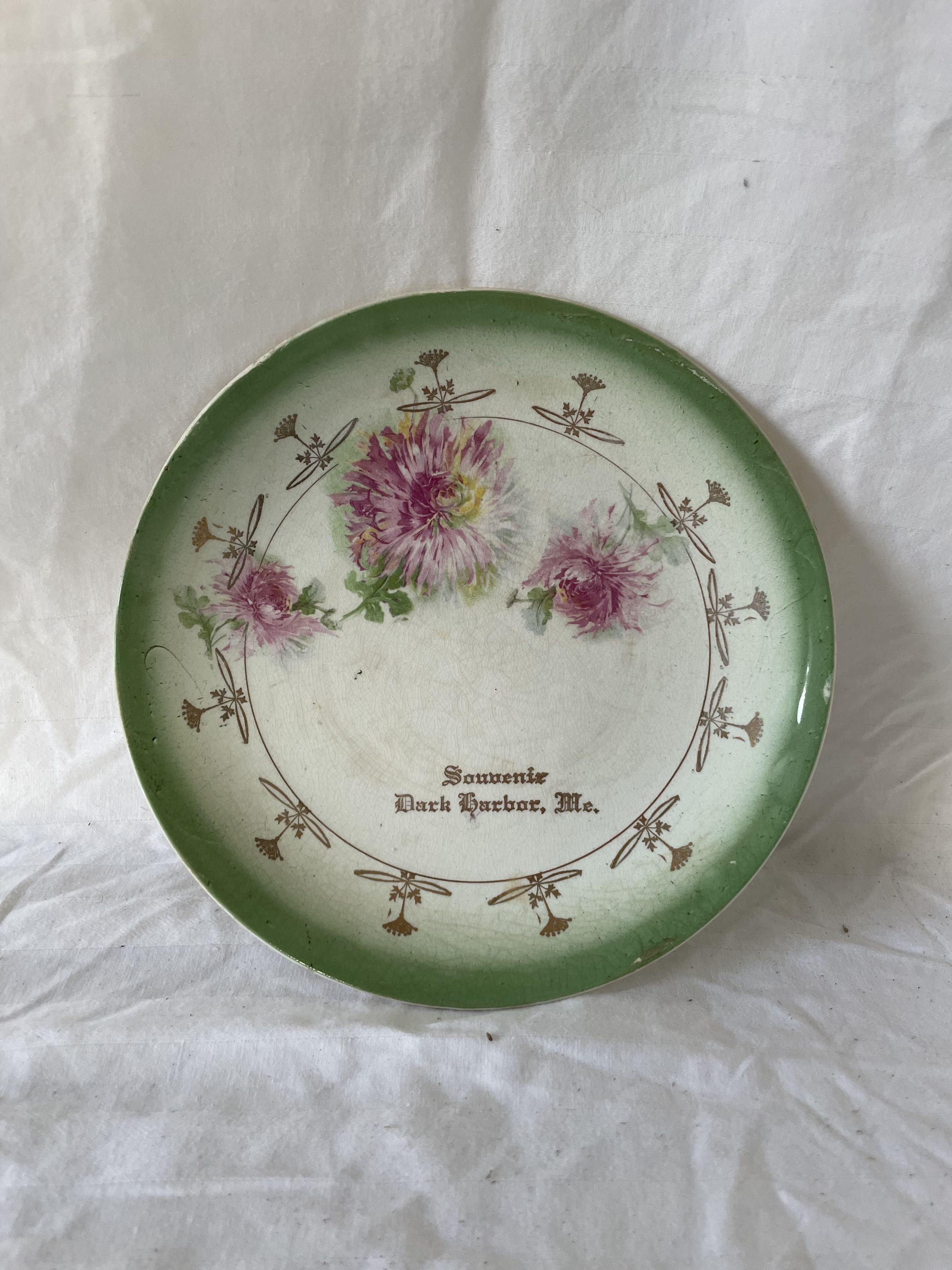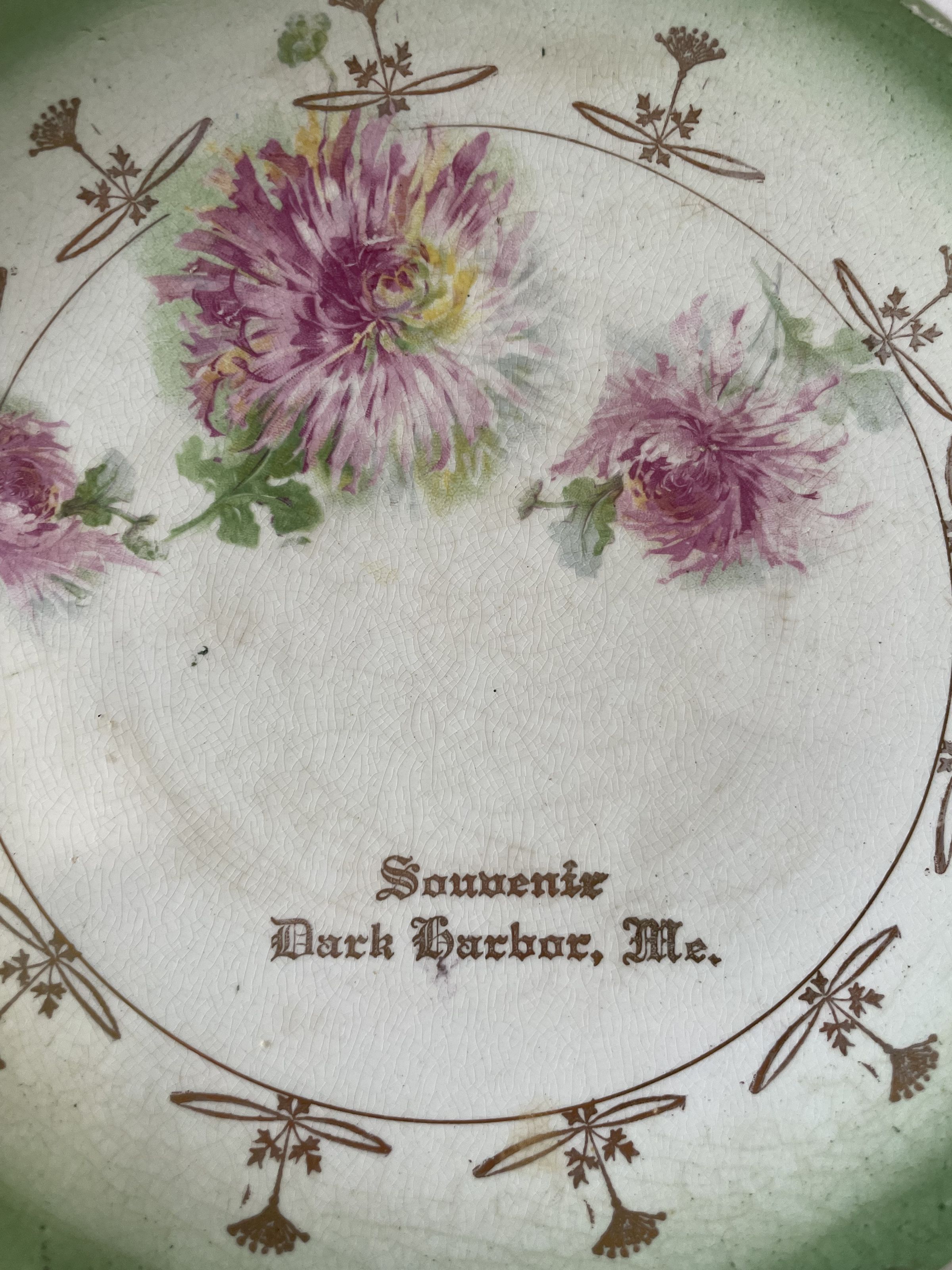 A white ceramic/china plate with green tint and three large pink peony flowers. The plate also features a ring of gold flower designs. The plate reads, in gold print: "Souvenir of Dark Harbor, ME".