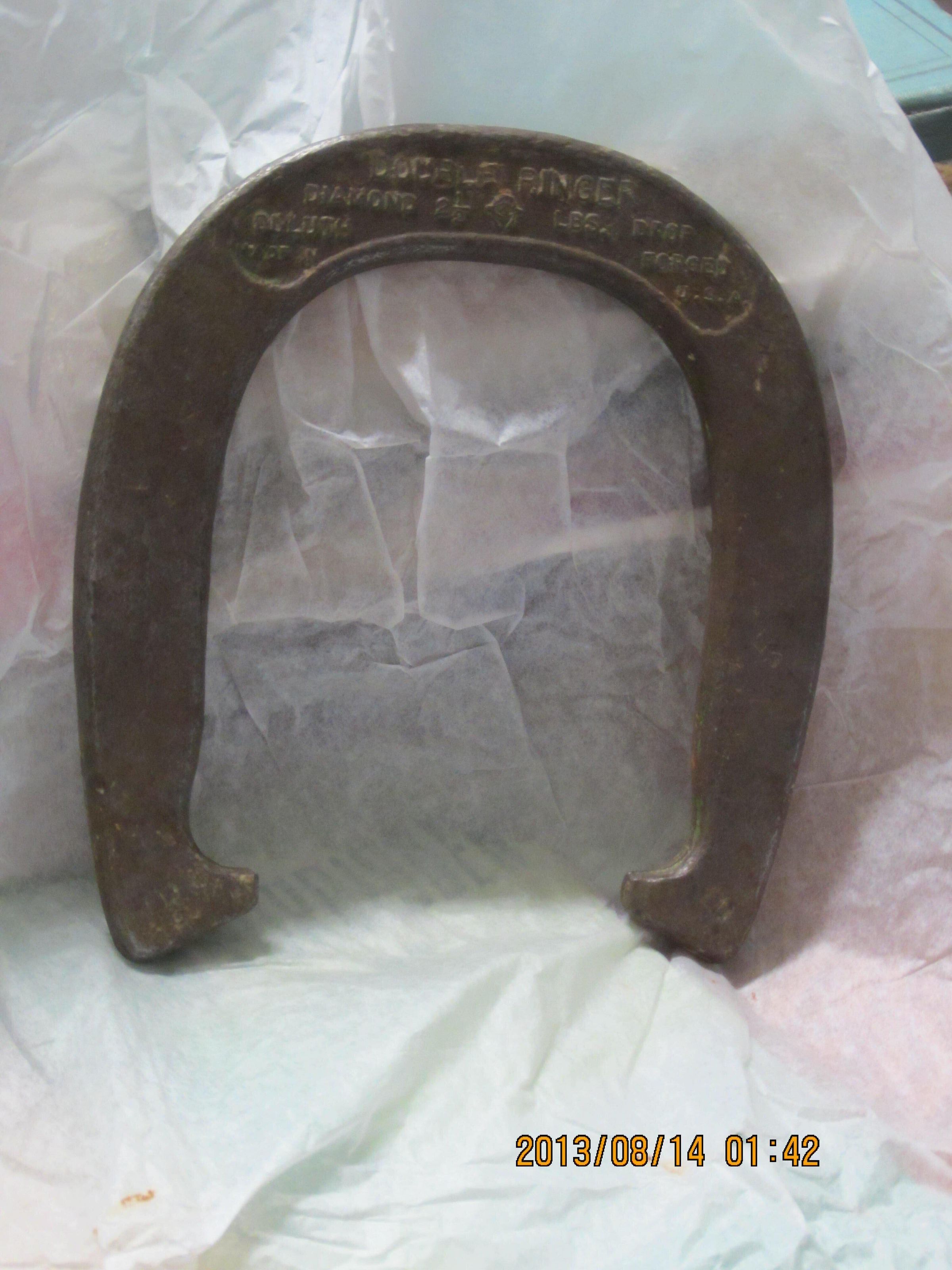 A regulation size horseshoe (7 1/2 inches long, 7 inches wide, weighing 40 oz. or 2 1/2 lbs.) for the game of horseshoes. One of a pair.