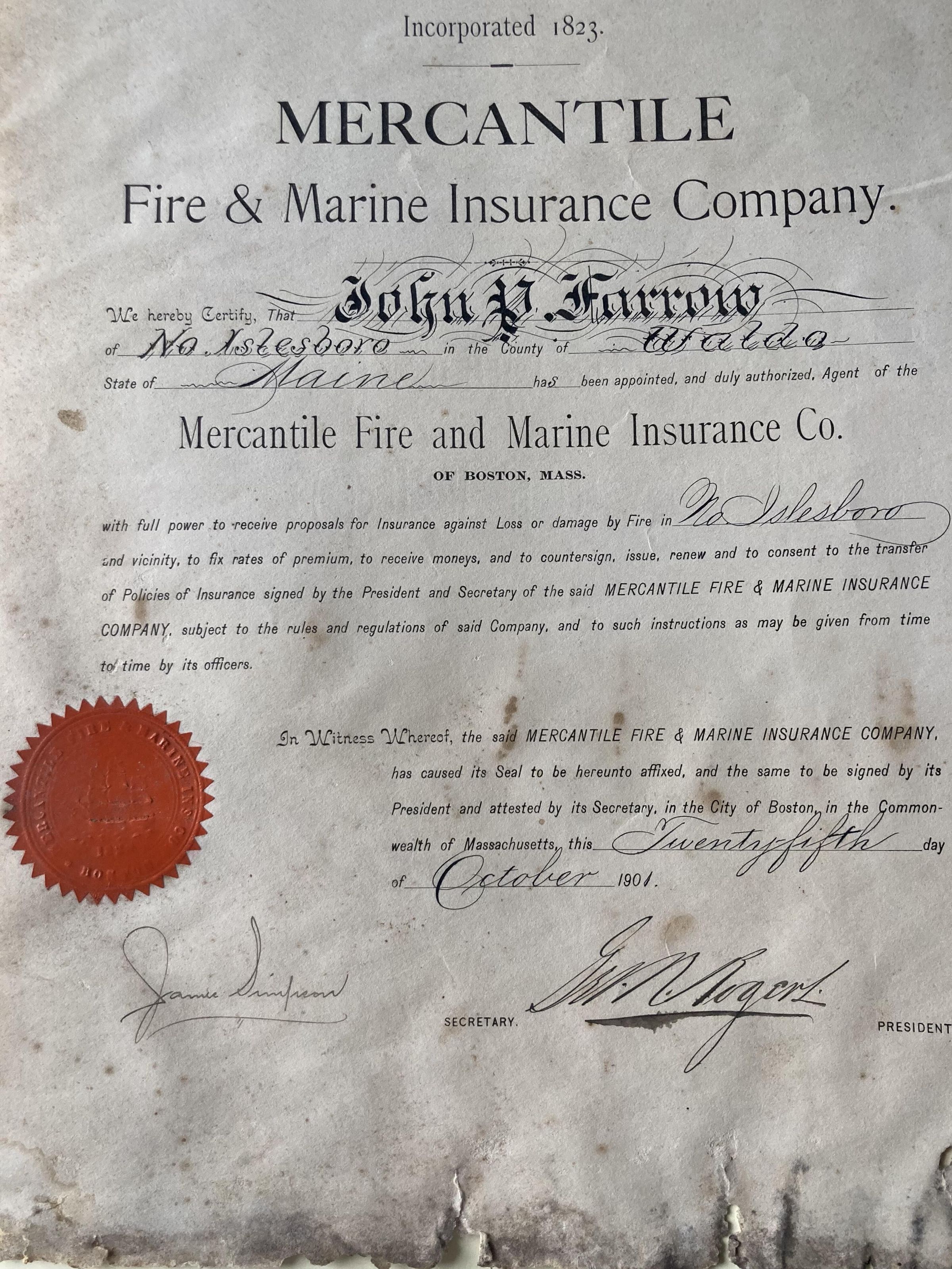 Certification for John P. Farrow as insurance agent issued by the Mercantile Fire & Marine Insurance Company, October 25, 1901.