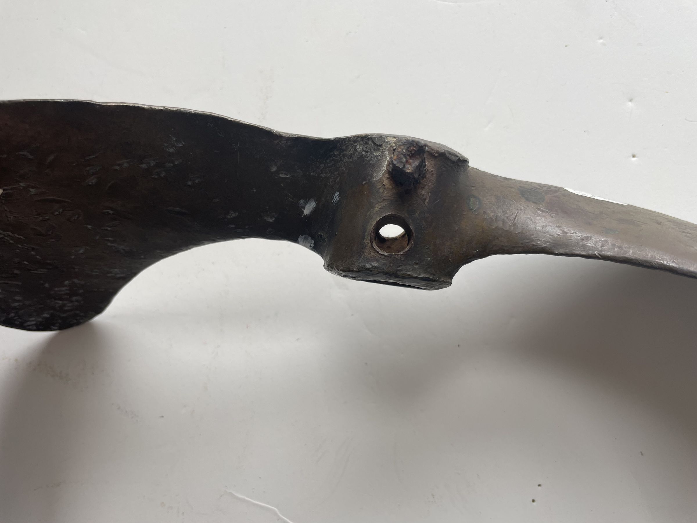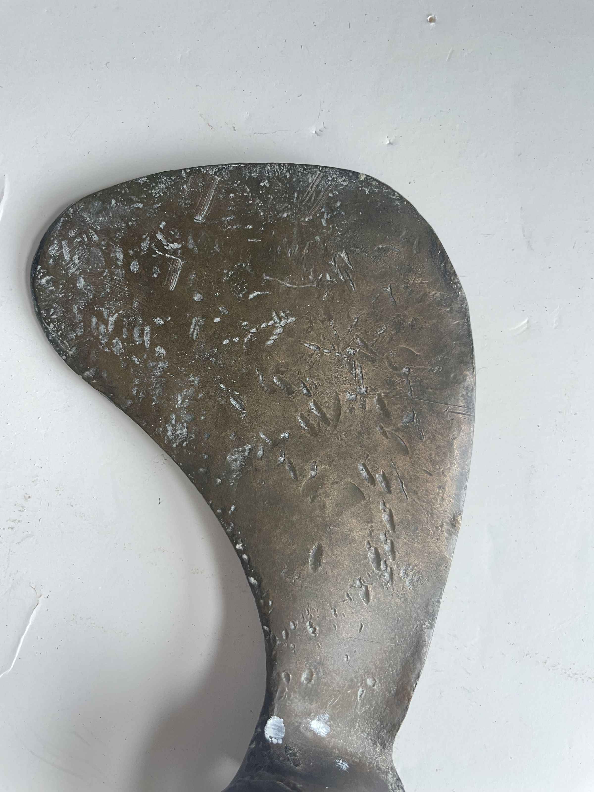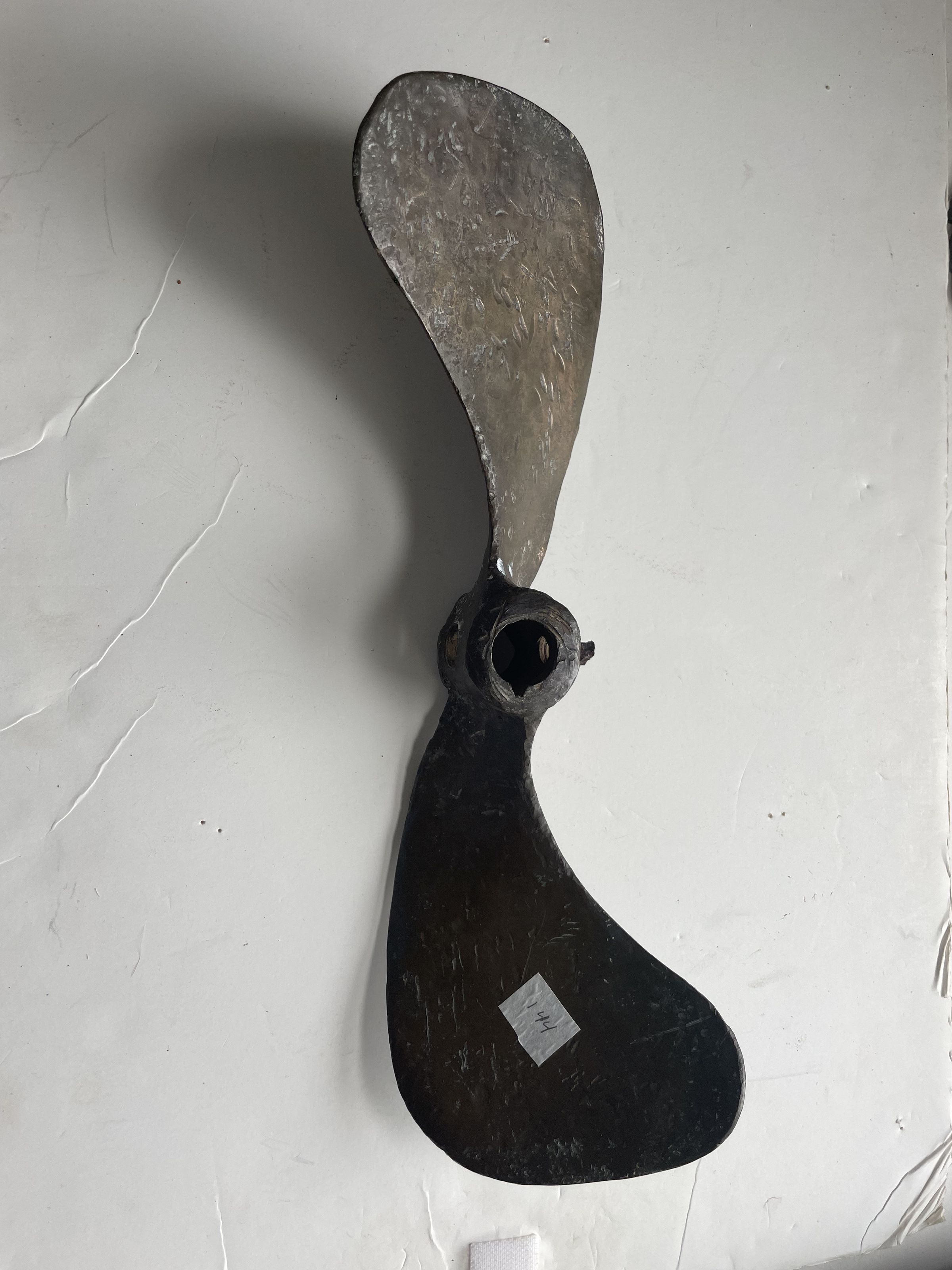 A two bladed brass propeller with a central connection point. It has minimal rusting and was most likely used on a small engine.