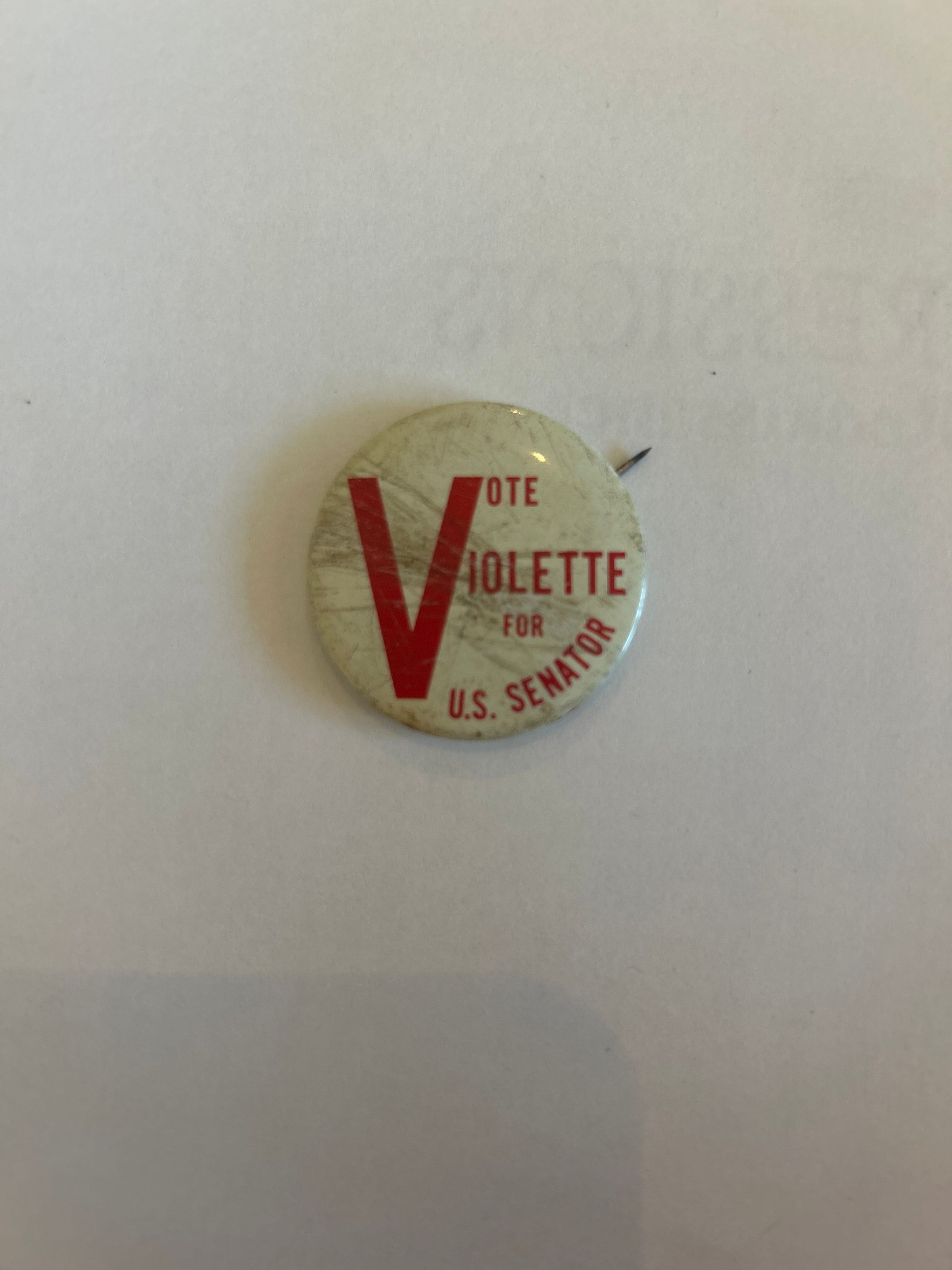 1 3/8 inches in diameter, white with inscription in red letters: