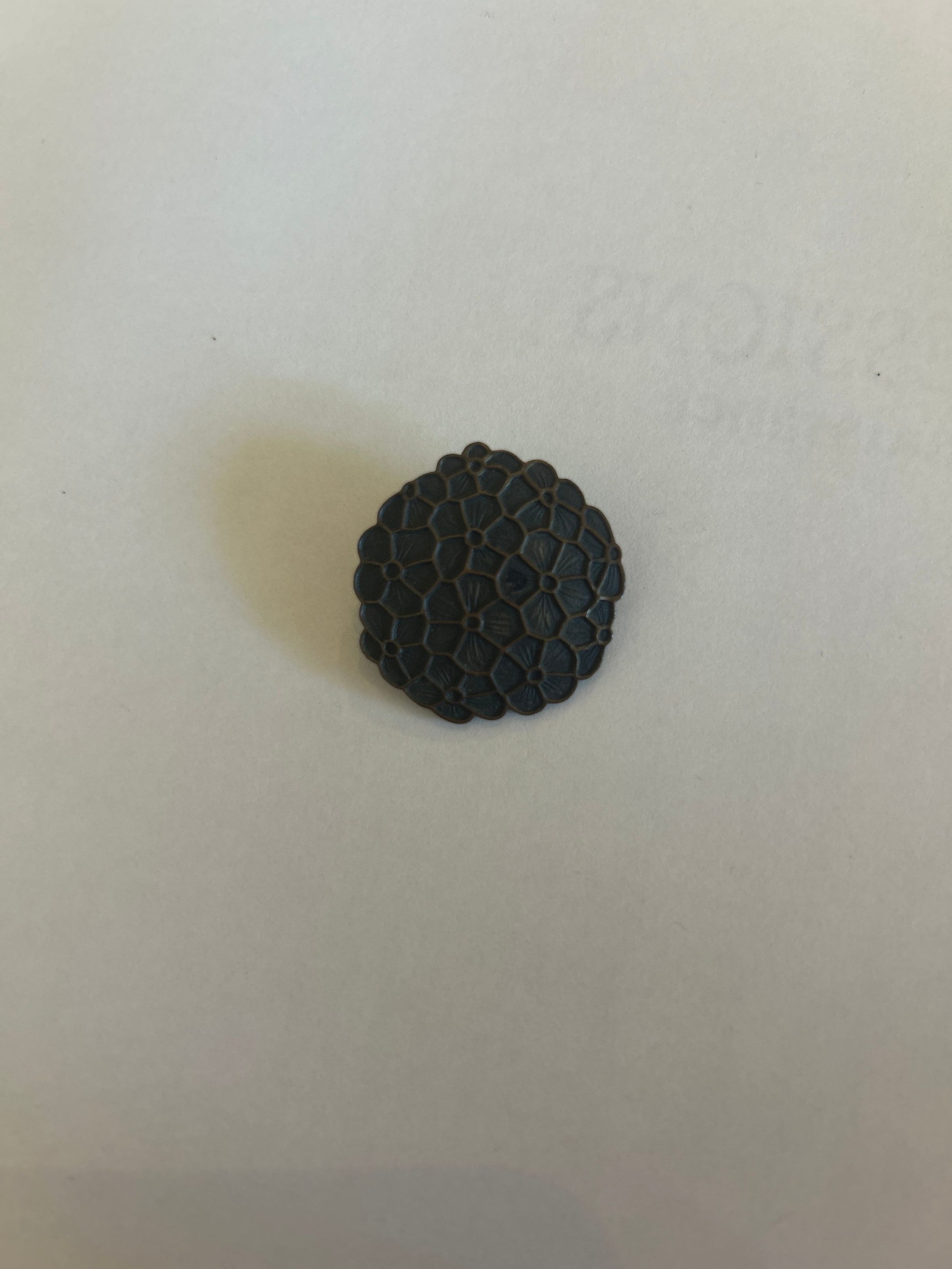 Brass pin for clothing, 1 1/8 inches in diameter. Raised pattern of flower blossoms, each with center and 5 petals. Clasp on the back.