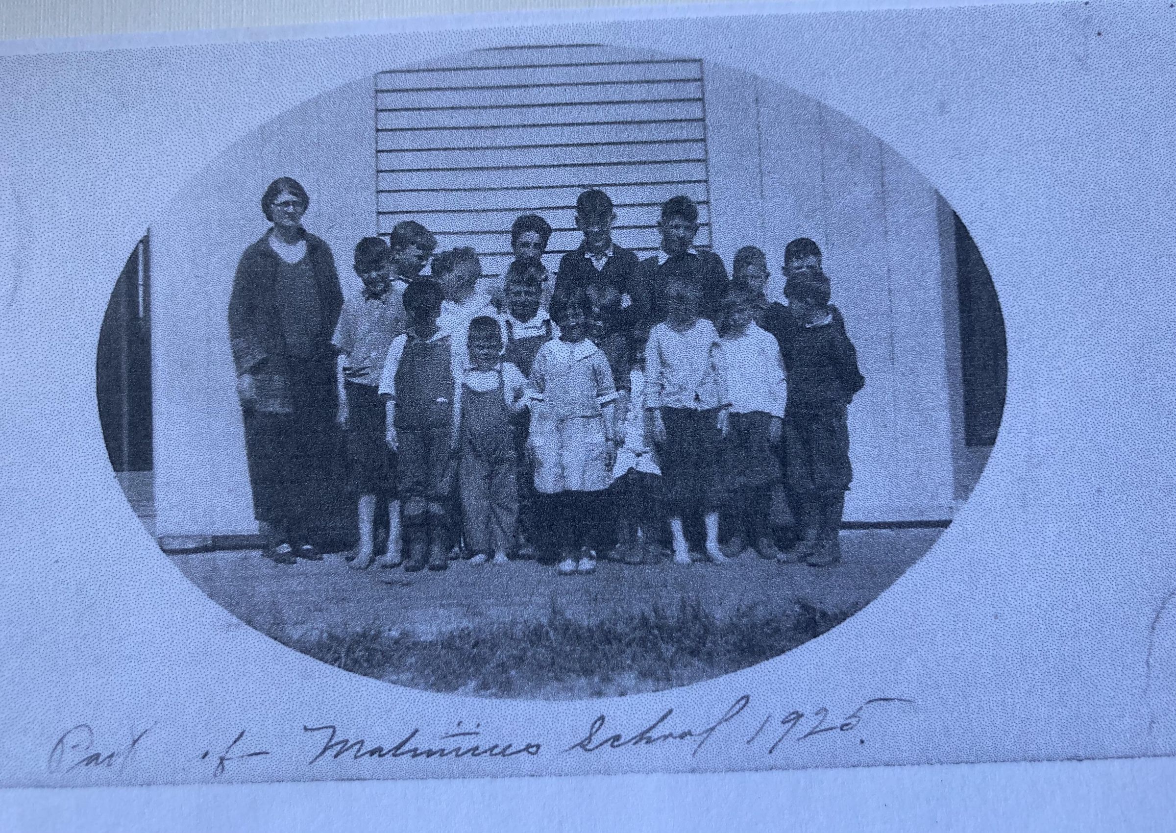 Alice E. Williams with her 1925 Matinicus School class. Images photocopied from a Mantinicus Island history. An attached note from Mrs. Florence Heath to her brother, Marcellus Williams, identifies their aunt Alice.