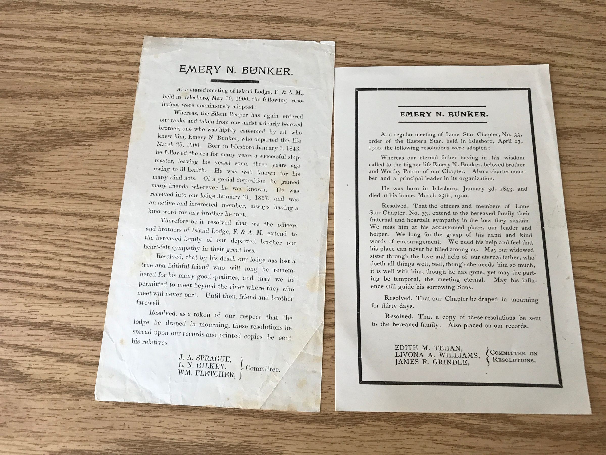 Masonic Lodge announcement of the 5/10/1900 death of Emery N Bunker