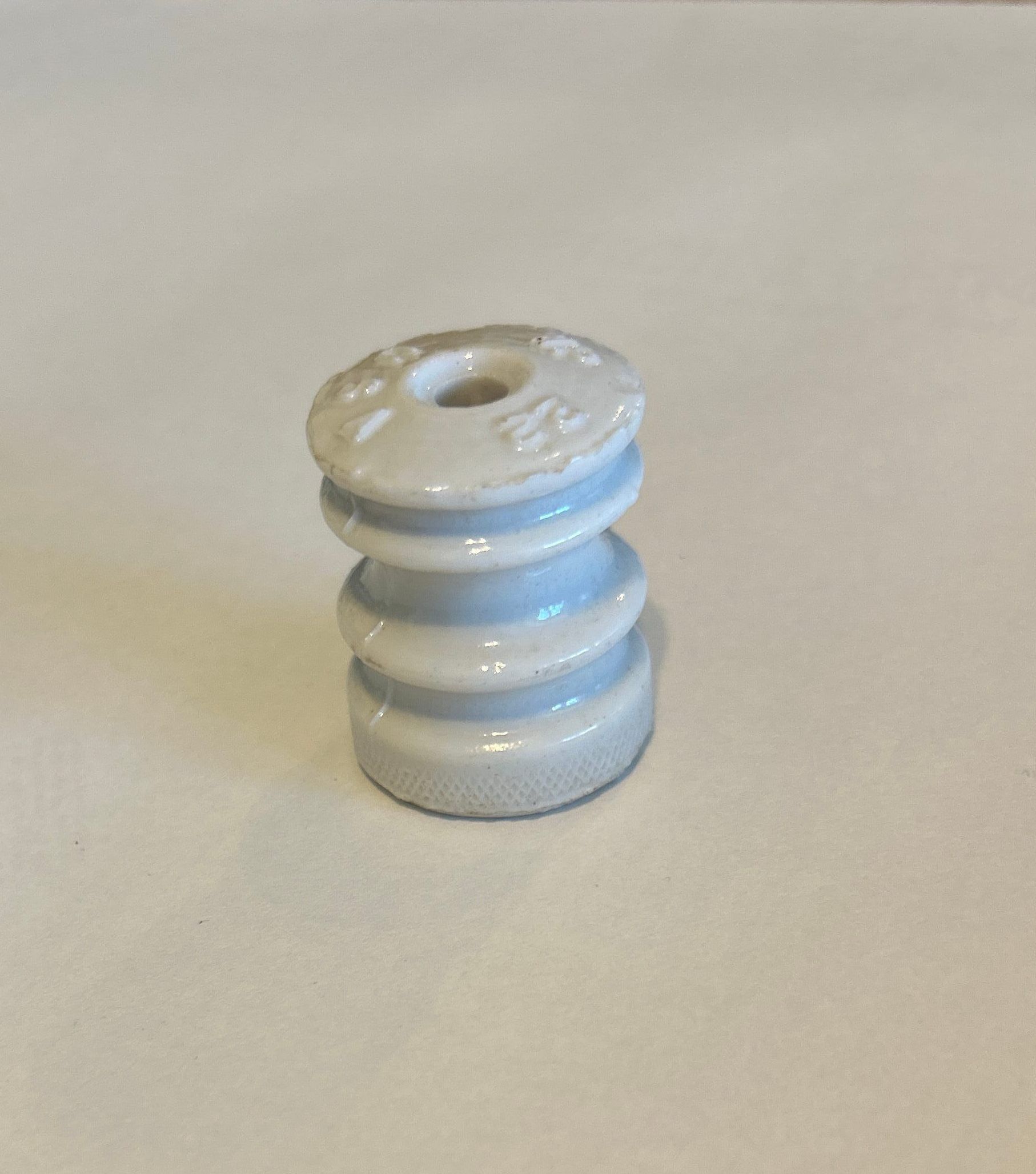 White ceramic insulator approximately 1 1/8 inches in diameter and 1 1/4 inches long with a threaded hole in the middle approximately 1/4 inch in diameter at the top of the insulator and increasing to 3/4 inch in diameter at the bottom. The outside has 3 grooves of different widths for wire. The top has the inscription "W P 22 U S A". This insulator is used in post and tube wiring.