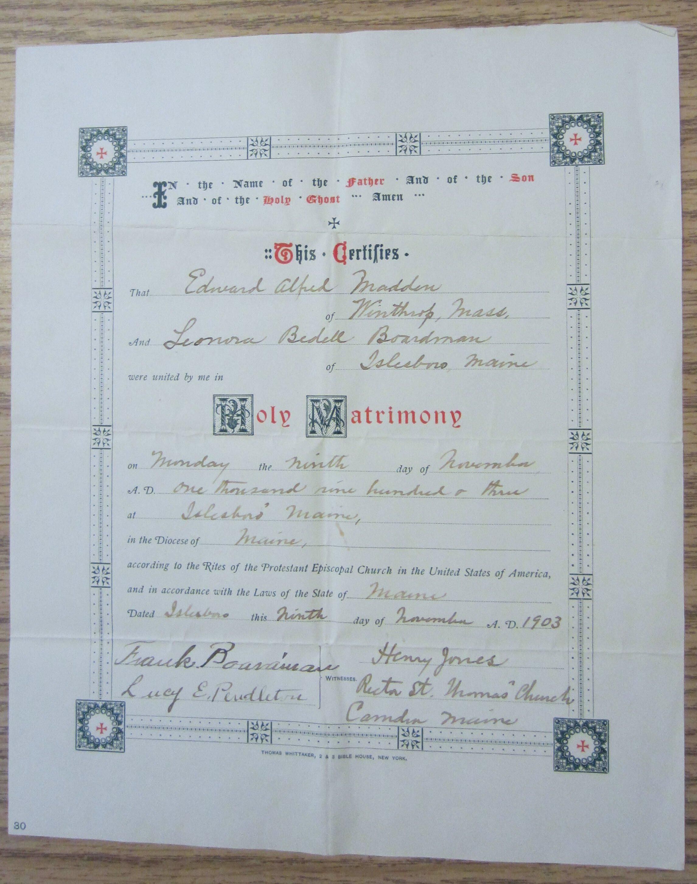 Marriage Certificate for Leonora Bedell Boardman of Islesboro and Edmund Madden of Winthrop, ceremony 11/9/1903 on Islesboro performed by Rev Henry Jones of Camden, Me.;announcement of marriage; newspaper account of their 25th wedding anniversary.