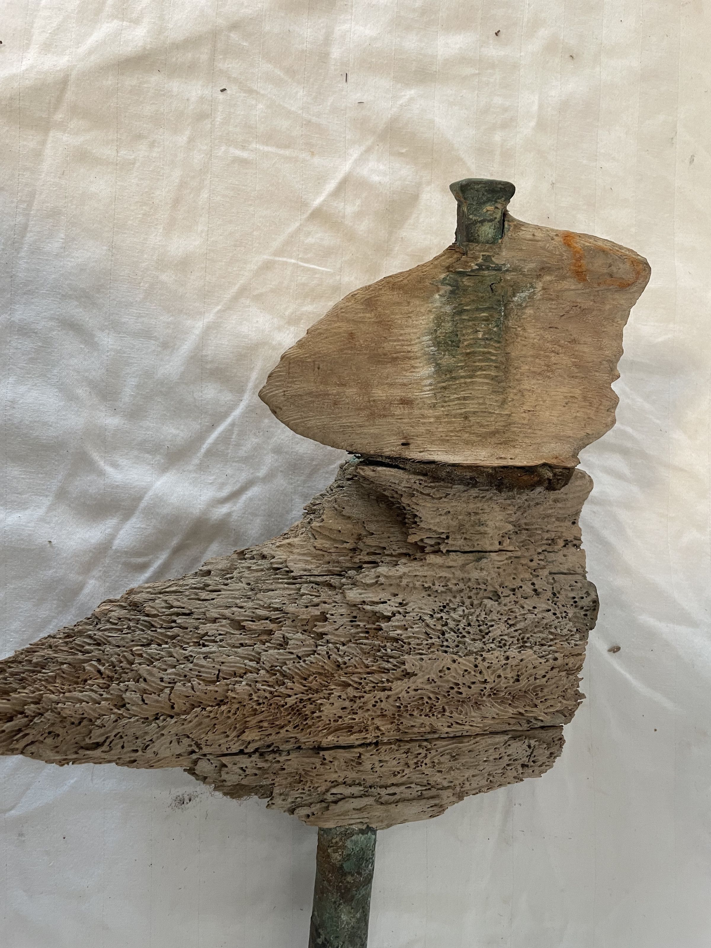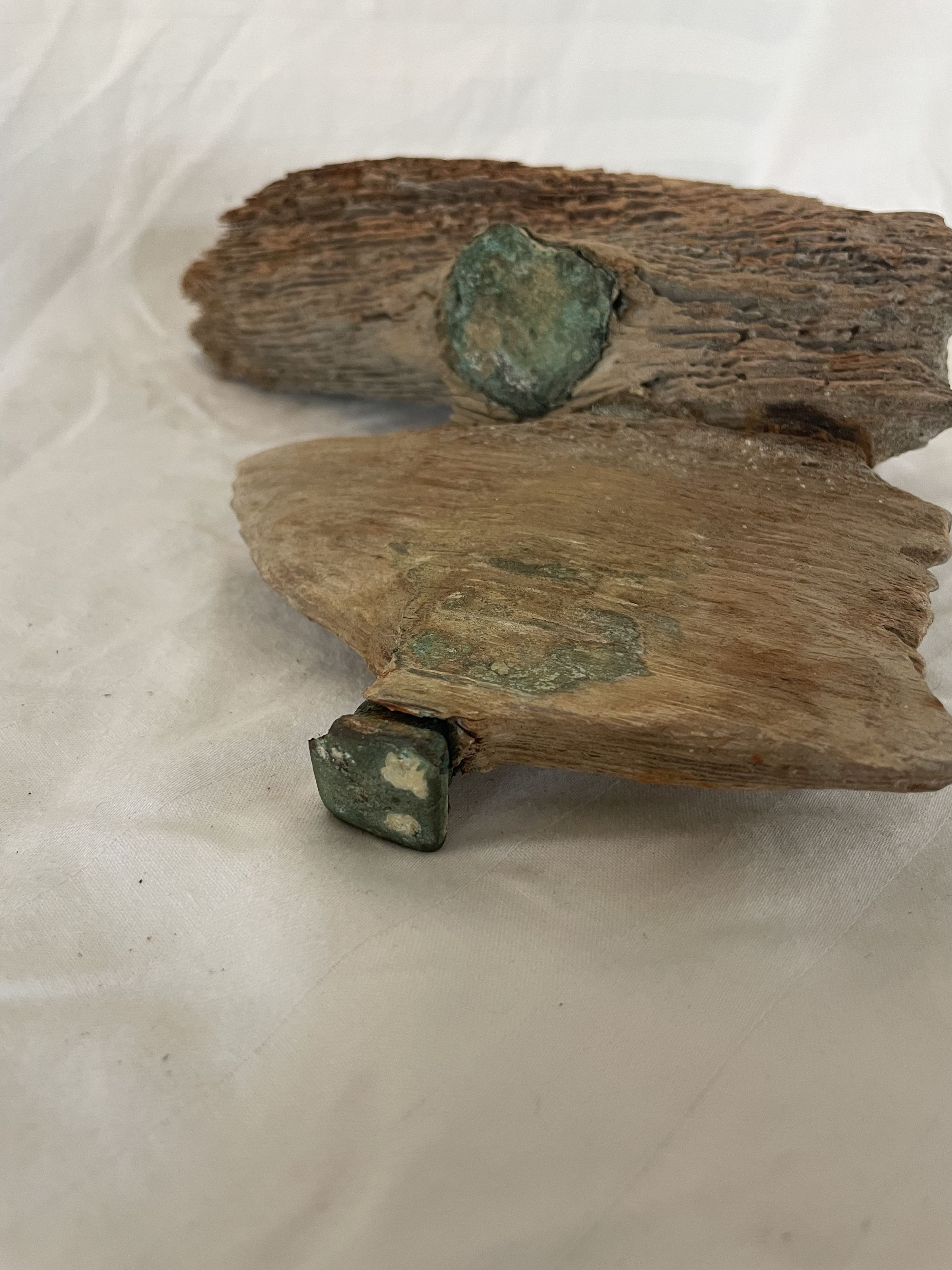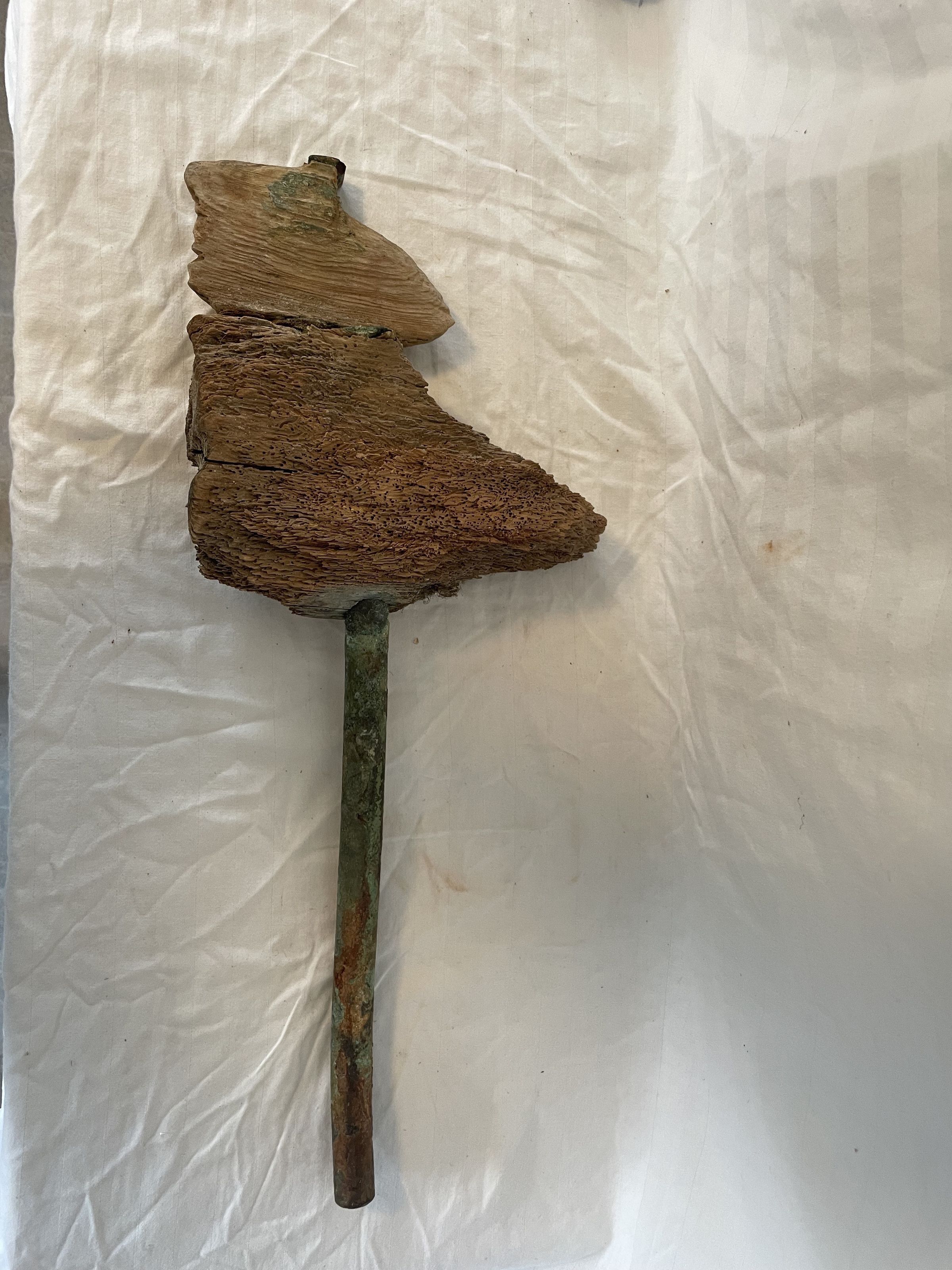Two planks of wood with spikes in it, one is round and one is square. The spikes are attached to a metal rod.