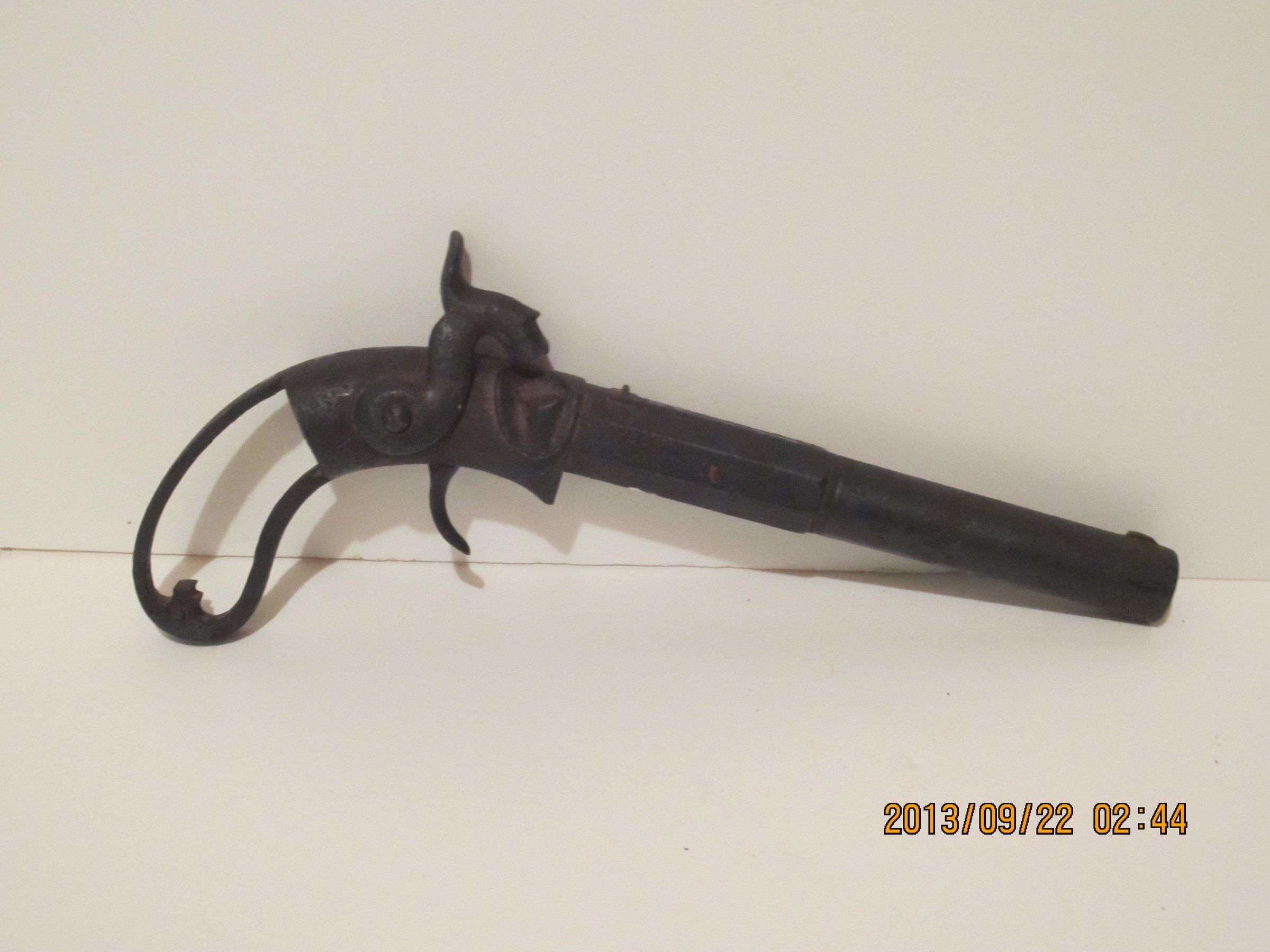Percussion pistol, 30 - 36 caliber length including curved "handle" 12 1/8 inches barrel 6 inches long. Dark Metal