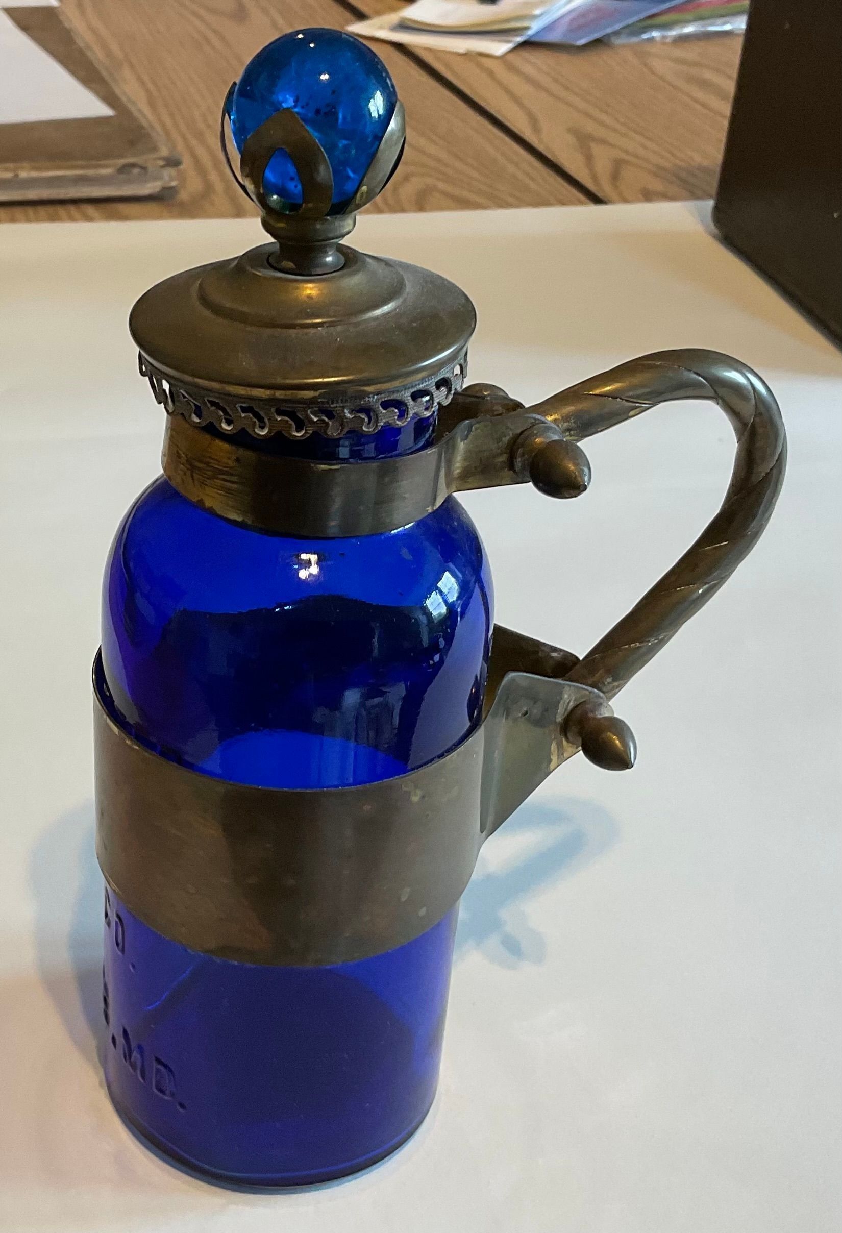 Glass bottle with brass handle and cork insert stopper. Donated with medical kit by the Alexander family.