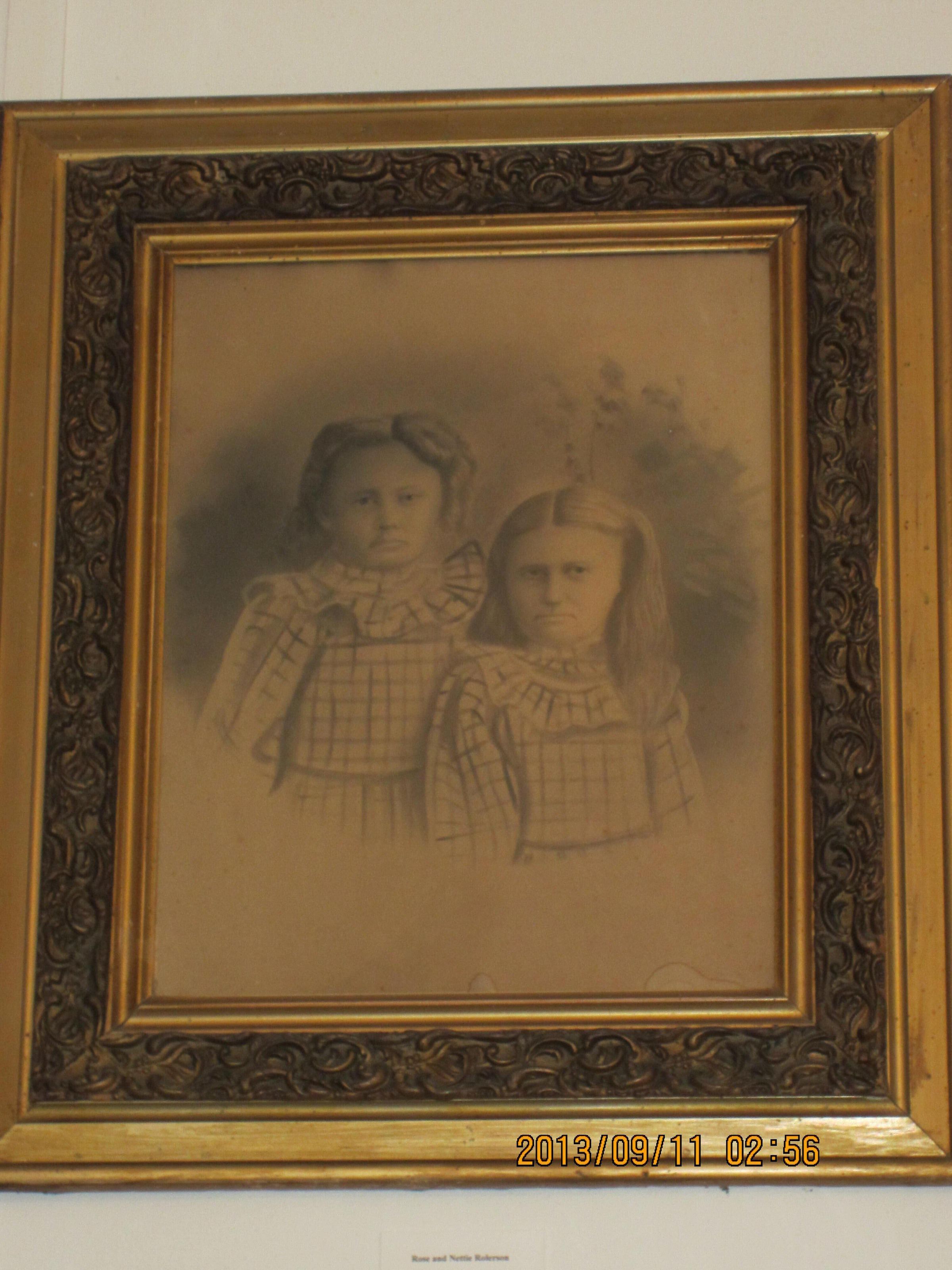 Portrait of Rose and Nettie Rolerson, daughters of P Leslie and Annette Davis Rolerson, probably died young, drawing ? or photo/charcoal, not matted, ornate frame, overall size c 2' x 3'.