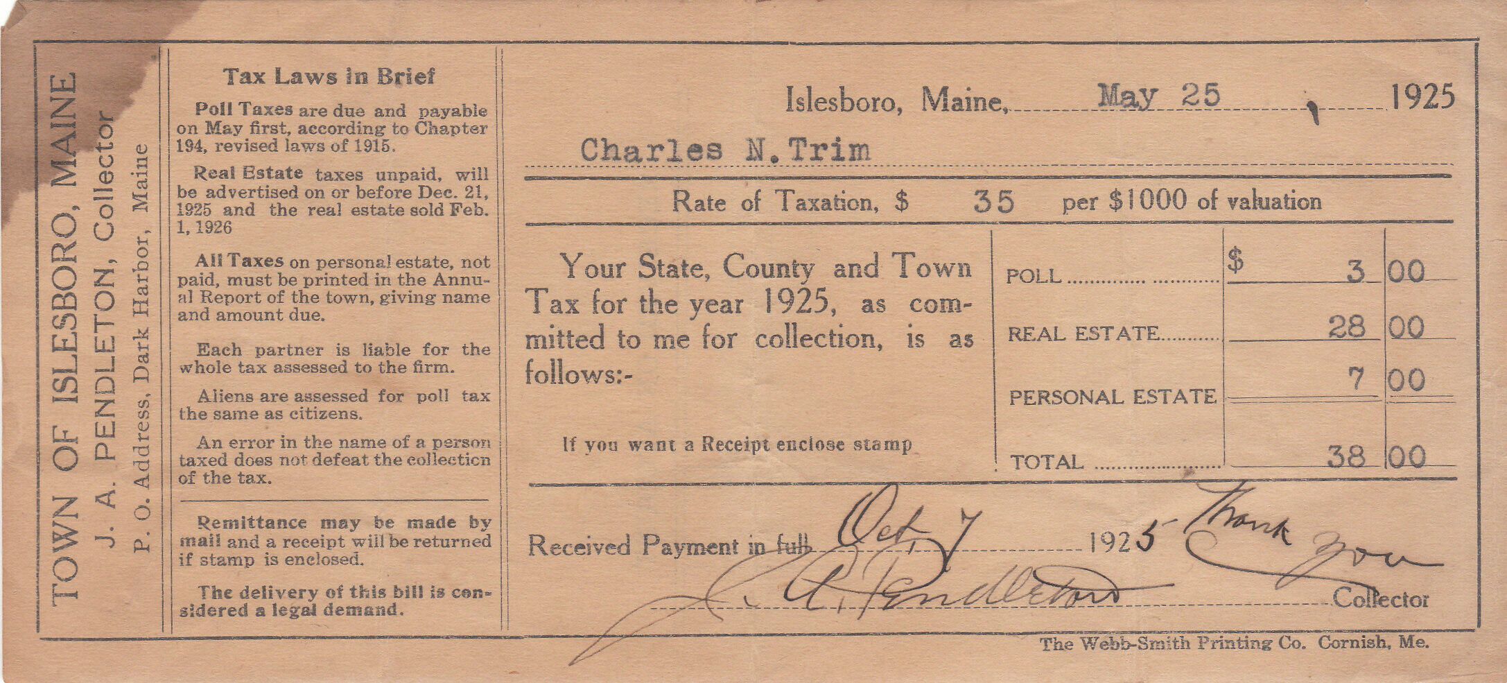 Tax assessments from the Town of Islesboro, with receipts, for Charles N. Trim and Kenneth R. Trim, of Dark Harbor, 1925-1949. Two envelopes sealed.