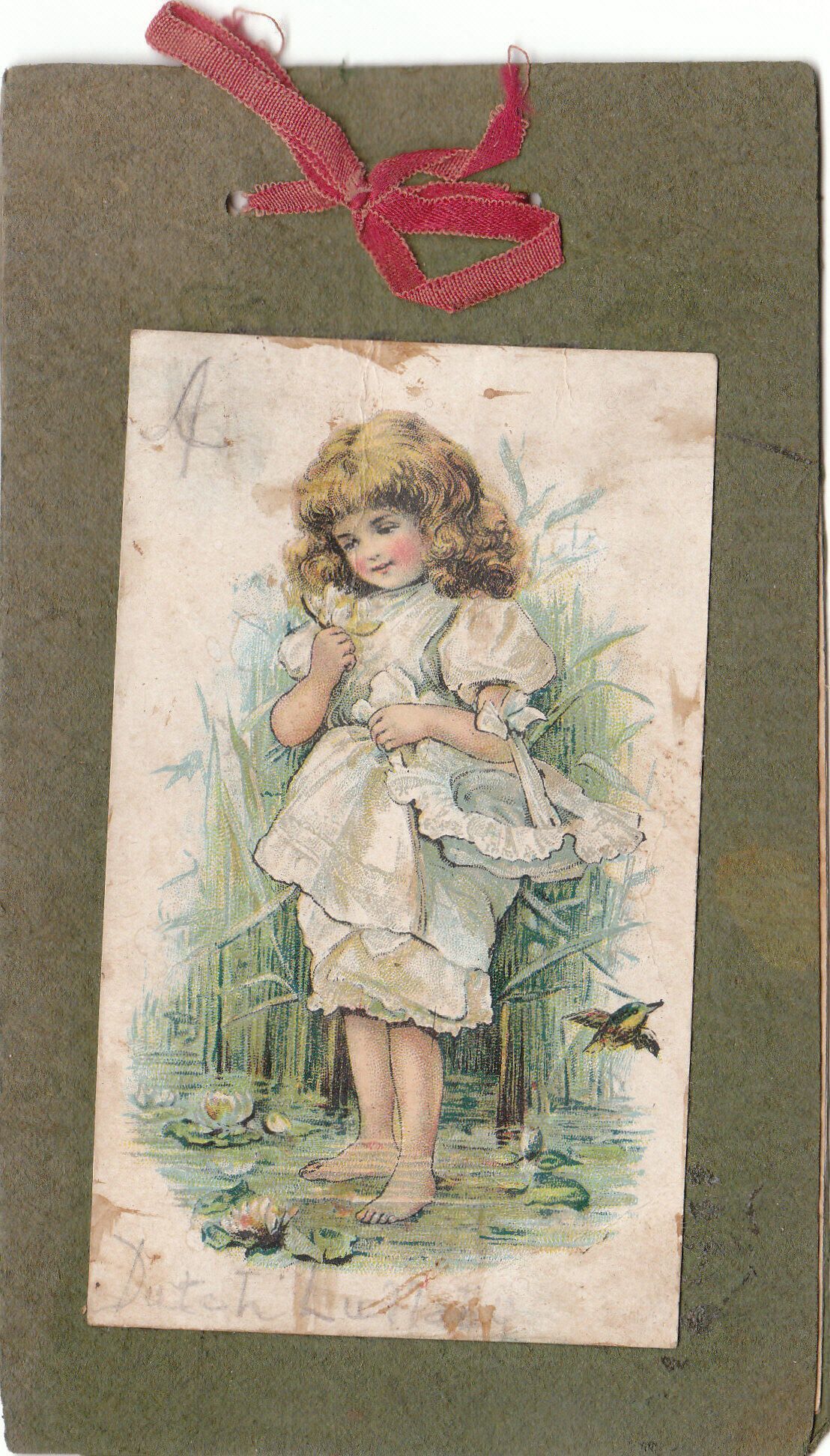 Child's notebook, small, green with red ribbon and image of little girl standing in a water-lily pool, and penciled name "Dutch Lu[--?]". Inside, hand-written in pencil, is the poem "Wyken, Blinken, and Nod."