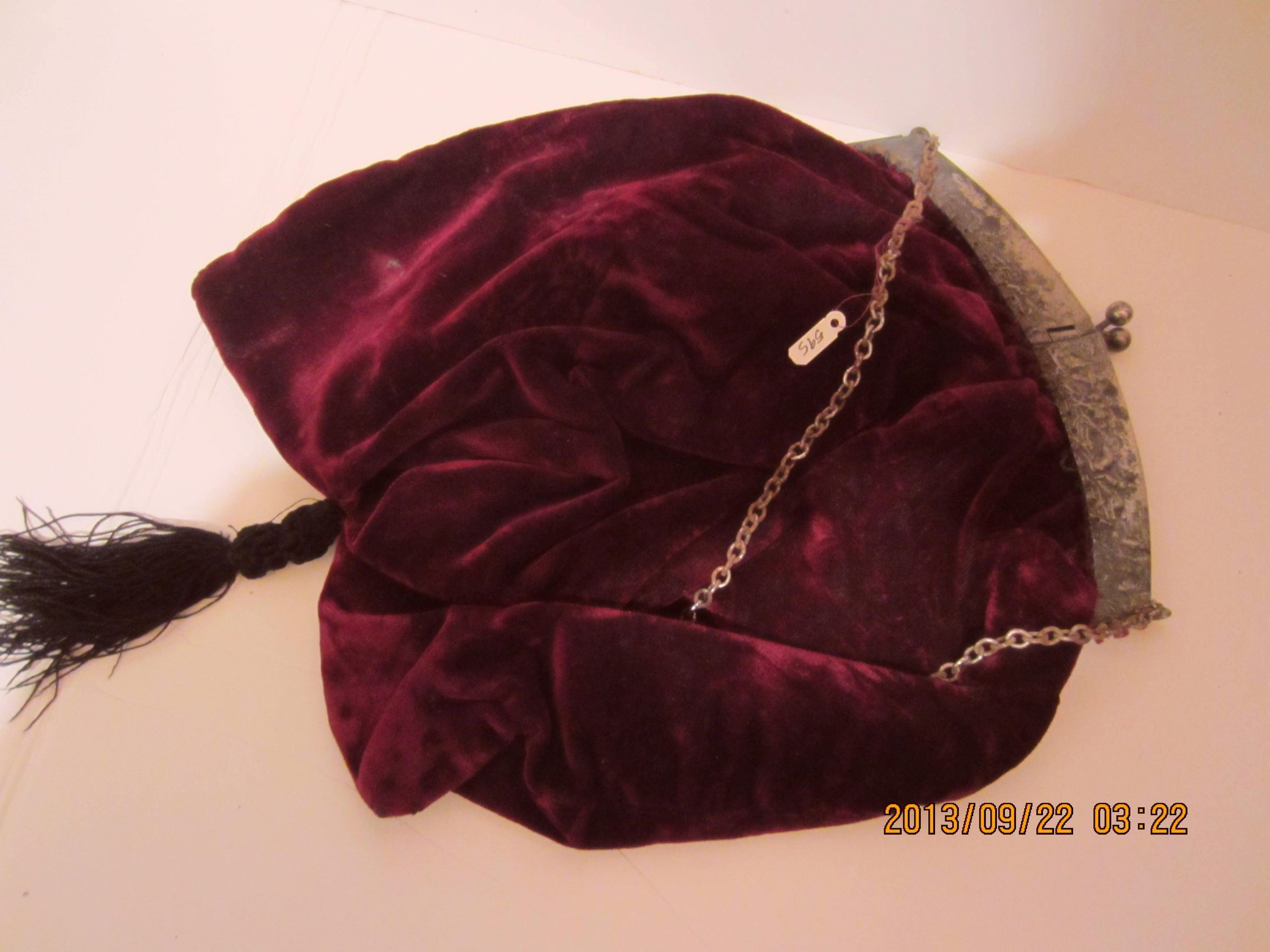 Maroon velvet purse measures 9 1/2 inches x 8 1/2 inches with 4 1/2 inch tassel. Lined with blue silk. Black silk tassel. Metal frame and clasp has a relief pattern of a hunt. Clasp is sewn crudely to bag with black thread. Link chain for carrying strap. 13 1/2 inches long.
