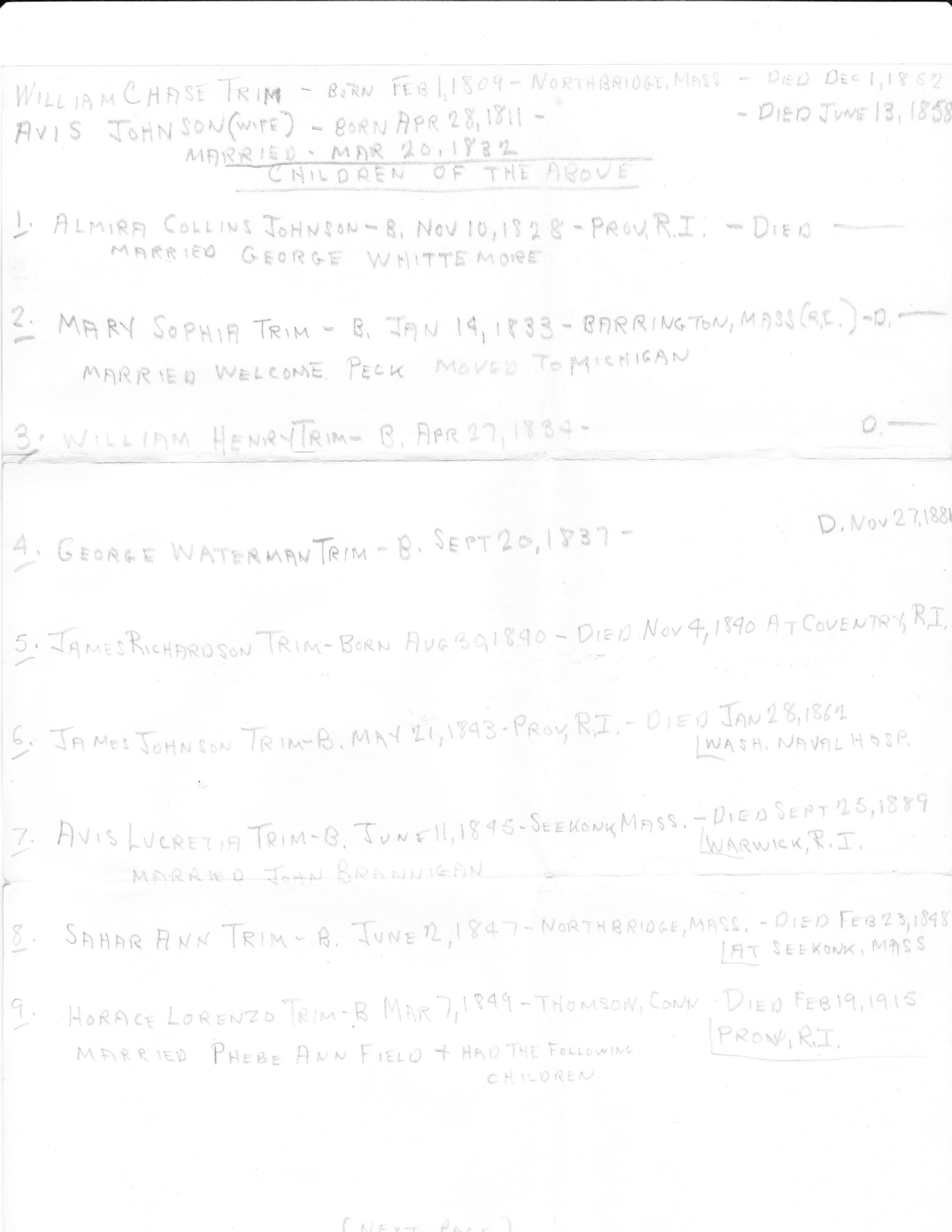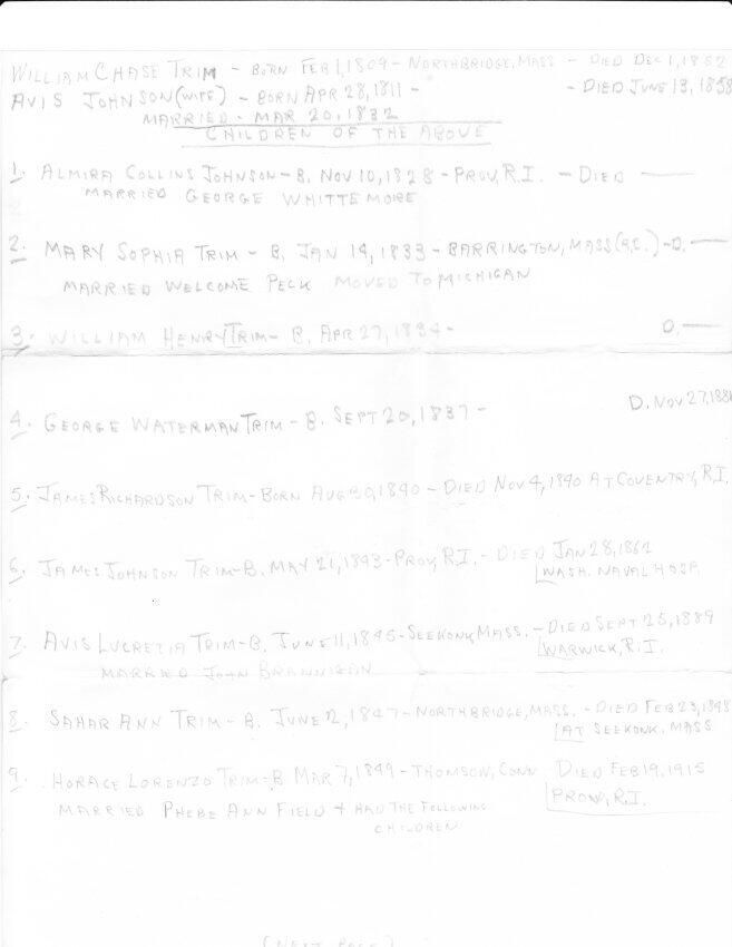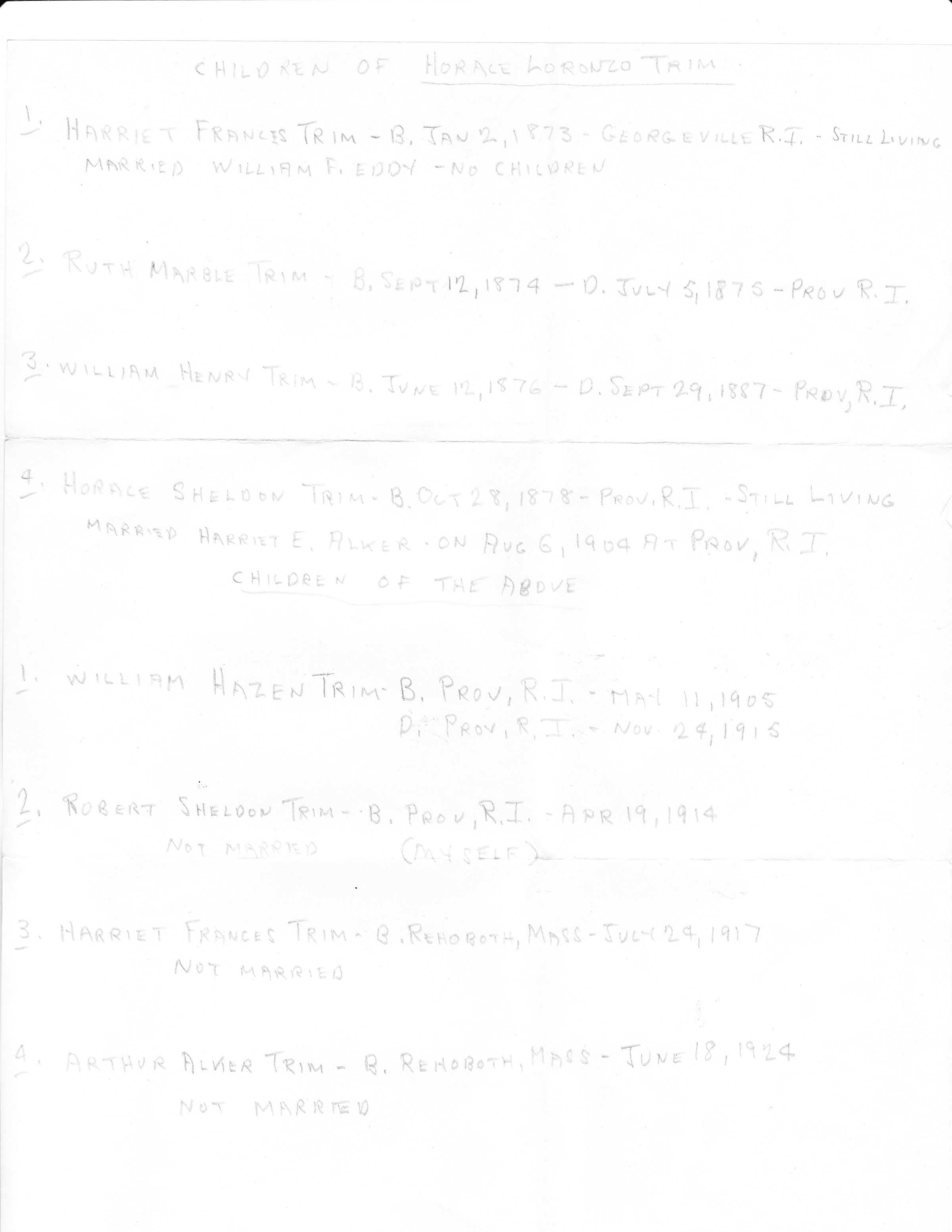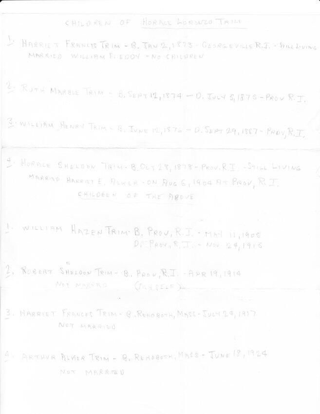 Children of William Chase Trim (Feb 1, 1809 - Dec 1, 1852, 1858) and Avis Johnson (Apr 28, 1811 - June 13, 1858); children of their youngest son, Horace Loreonzo Trim (Mar 7, 1848 - Feb 19, 1915) and Phebe Ann Field; and children of Horace and Phebe's youngest son, Horace Sheldon Trim (b Oct 28 1878) and Harriet E. Alker.