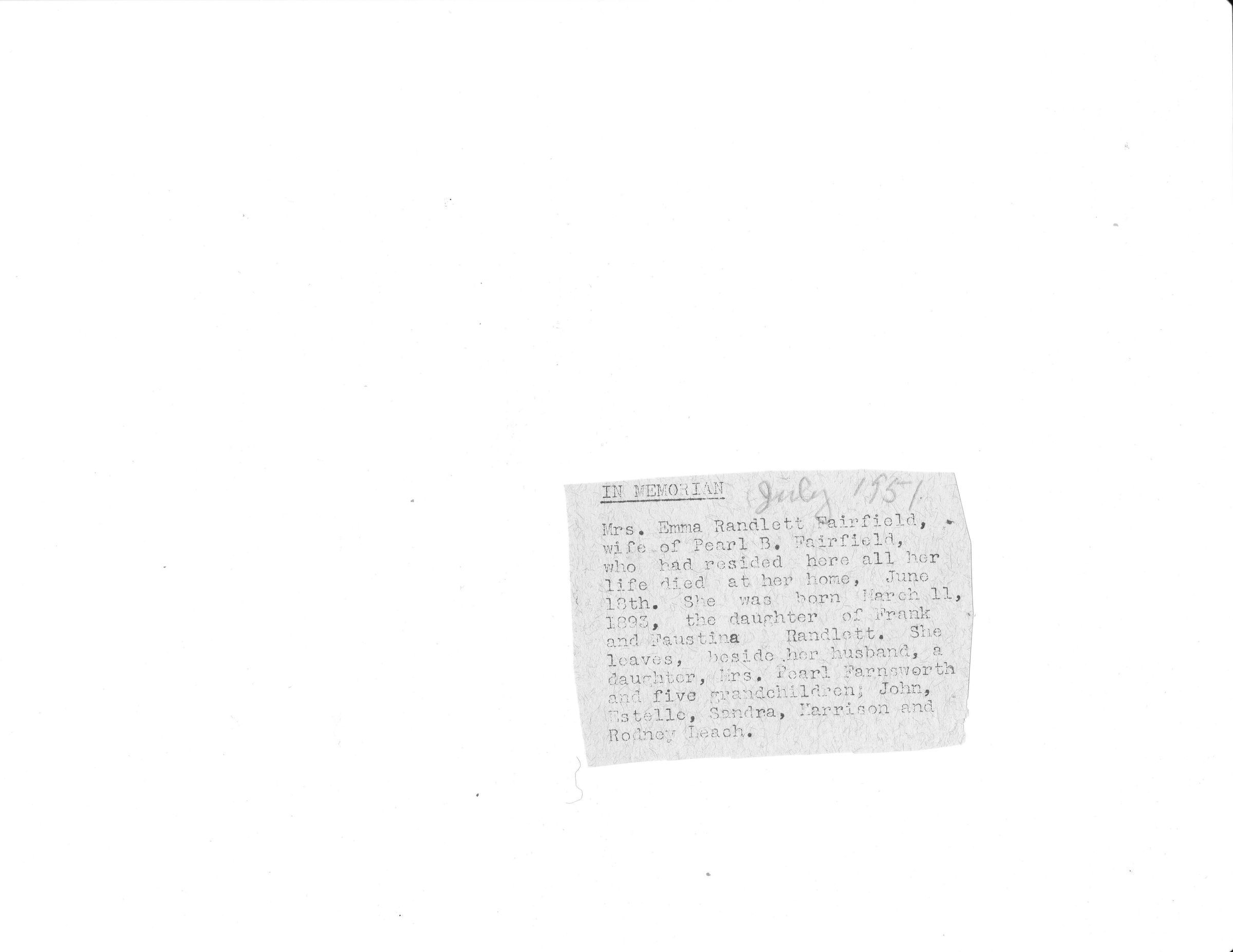 Newsletter clipping, dated July 1951, announcing the death of Mrs. Emma Randlett Fairfield, wife of Pearl M. Fairfield, on June 18.