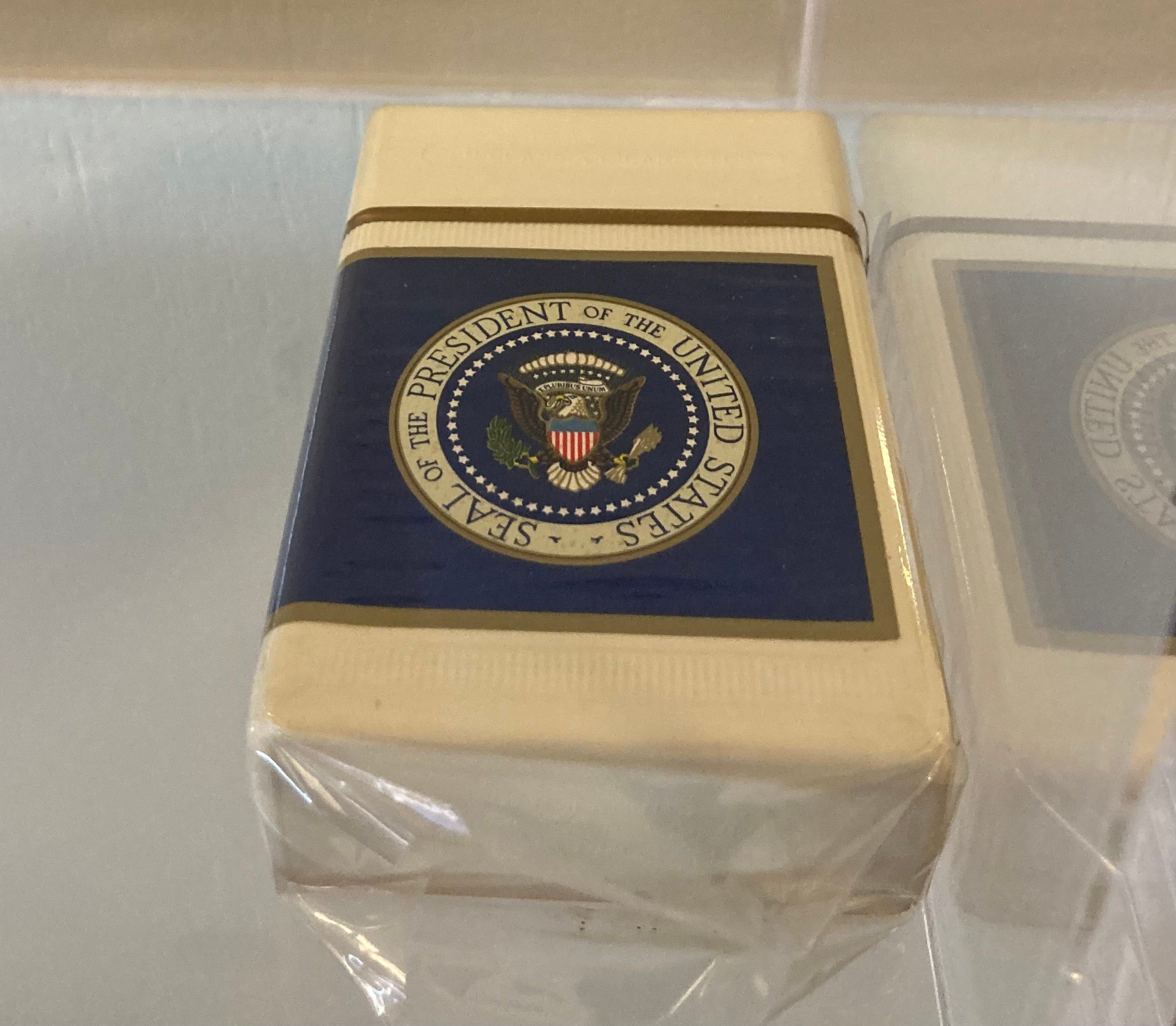 An unopened pack of cigarettes in a plastic box bearing the Presidential Seal. Measures 3 5/16 inches length, 2 1/2 inches width, 7/8 inch height.