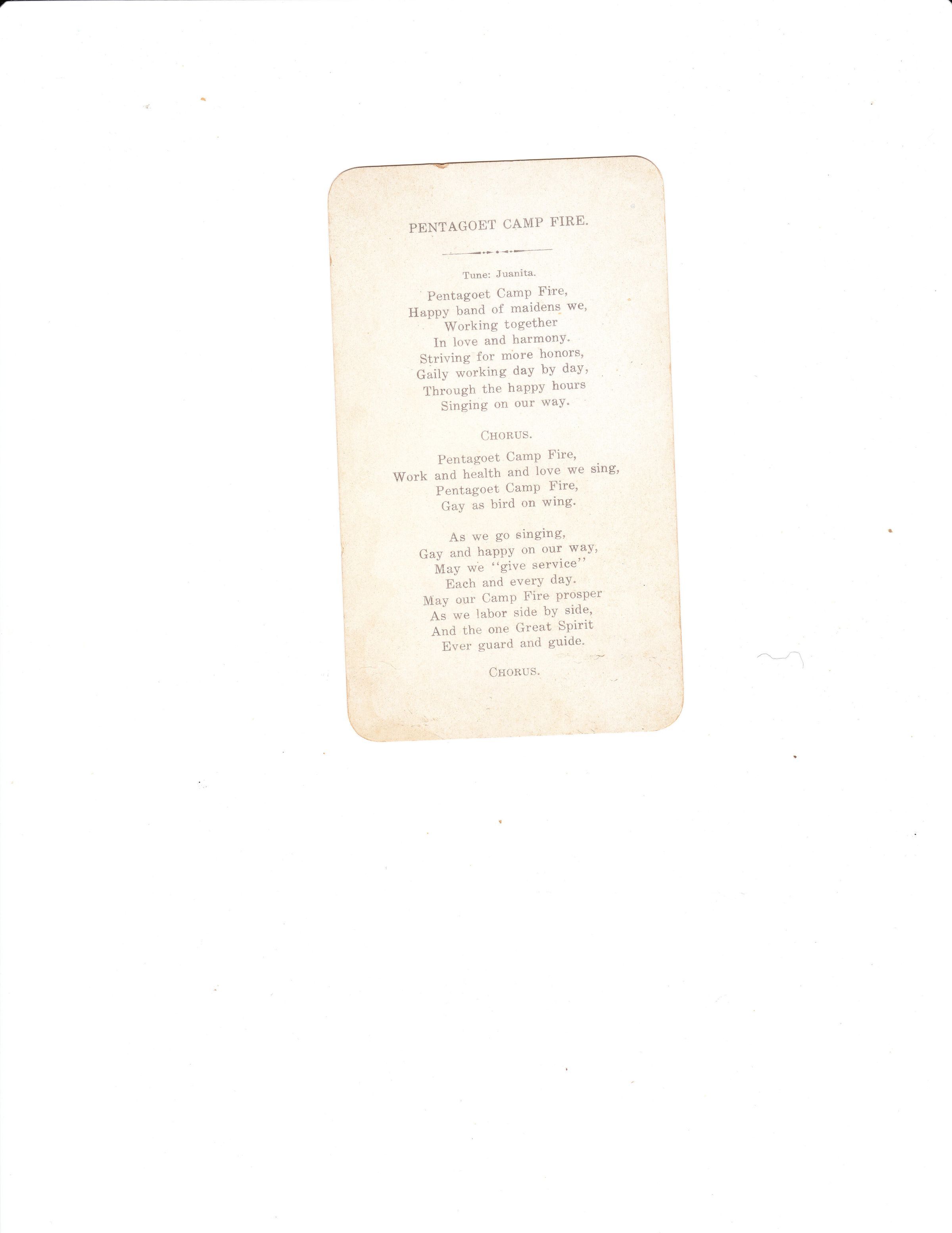 Girls' Petagoet Camp song, "Pentagoet Camp Fire," to the tune of "Juanita."
