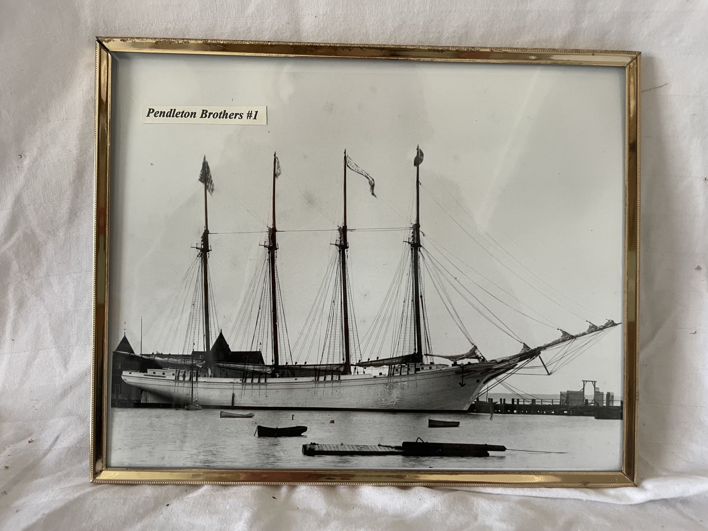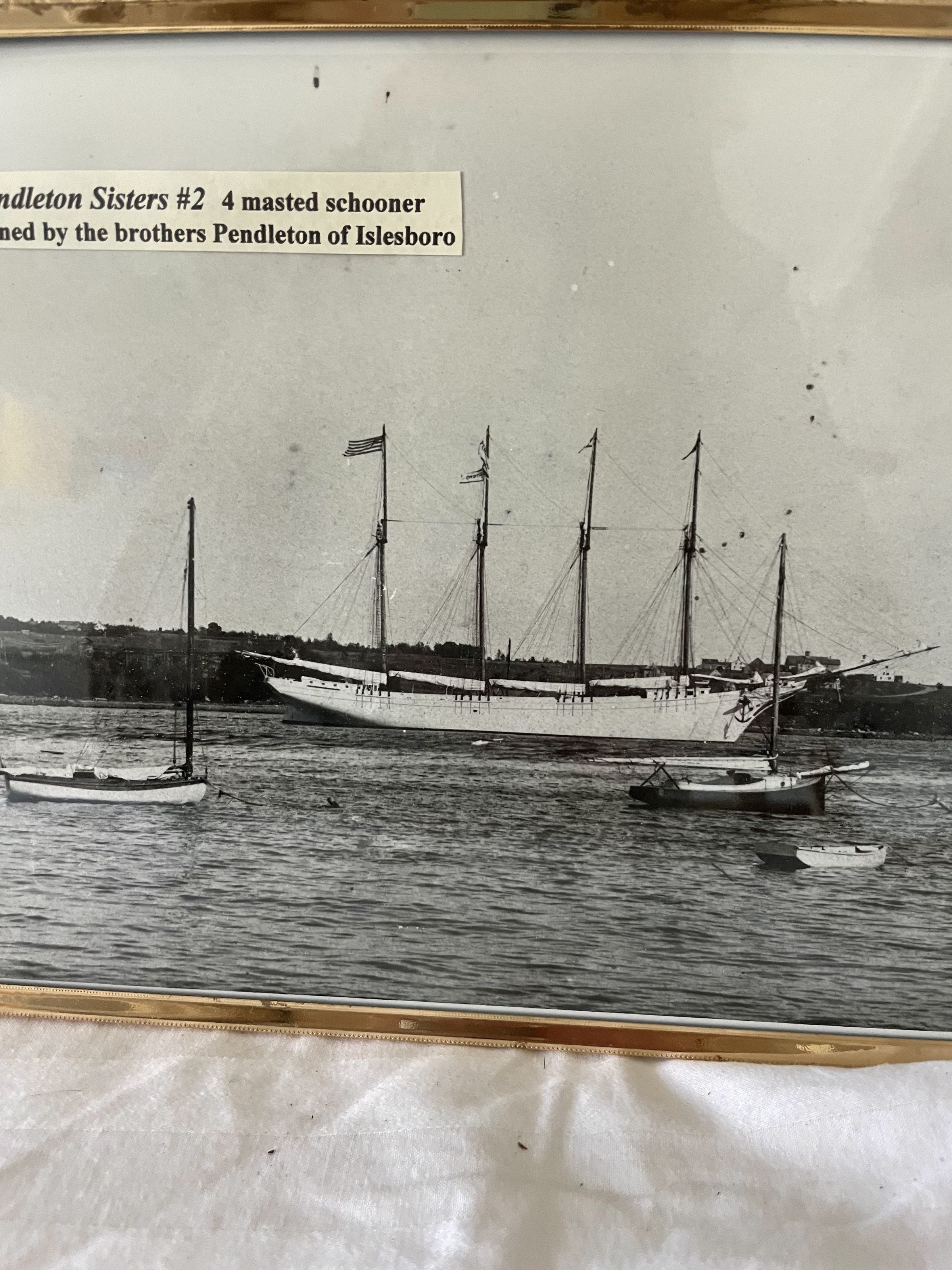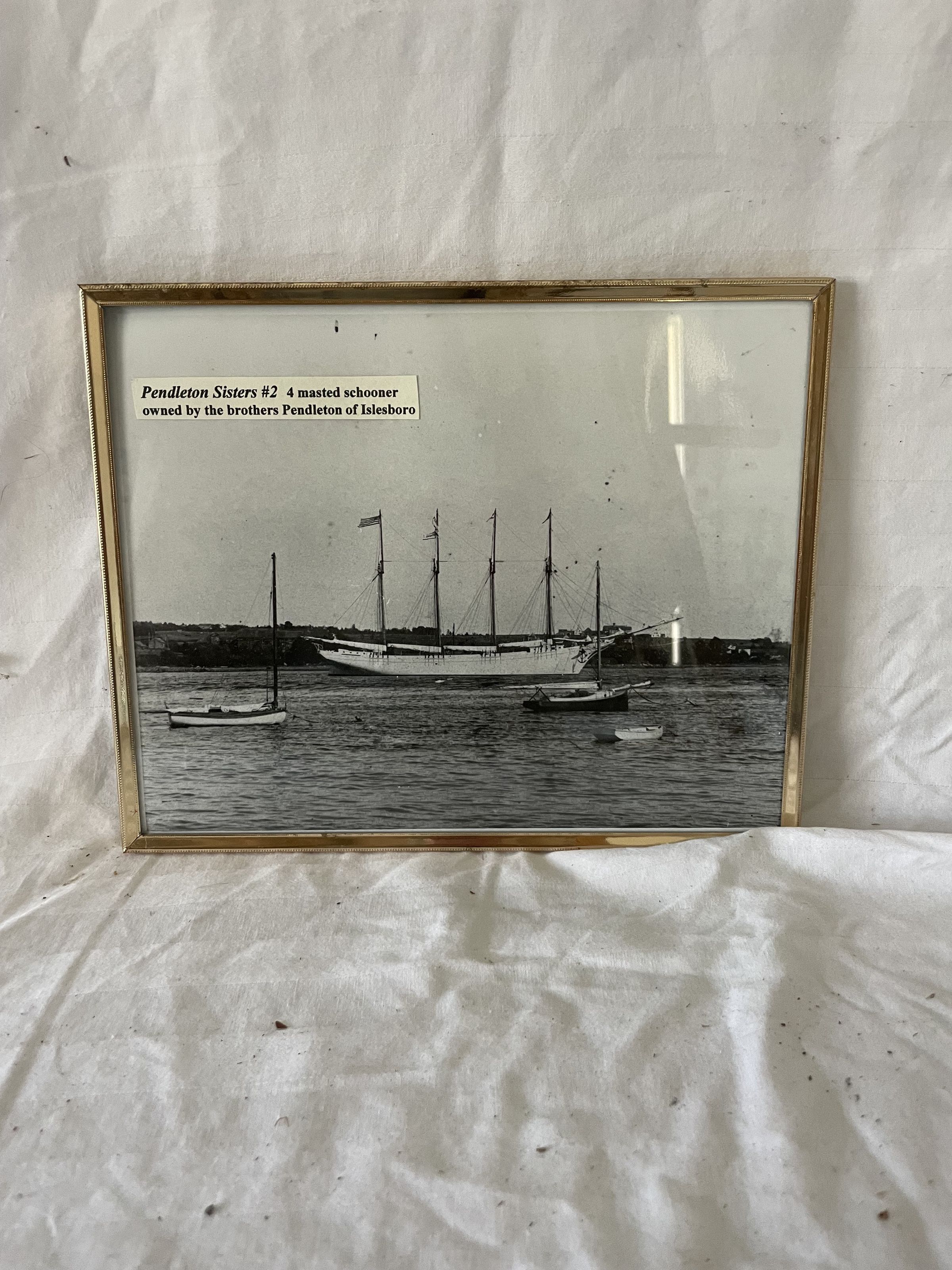 Images of schooners owned by the Pendleton brothers on Islesboro. Both images are in black and white and framed in metal gold coated frames.