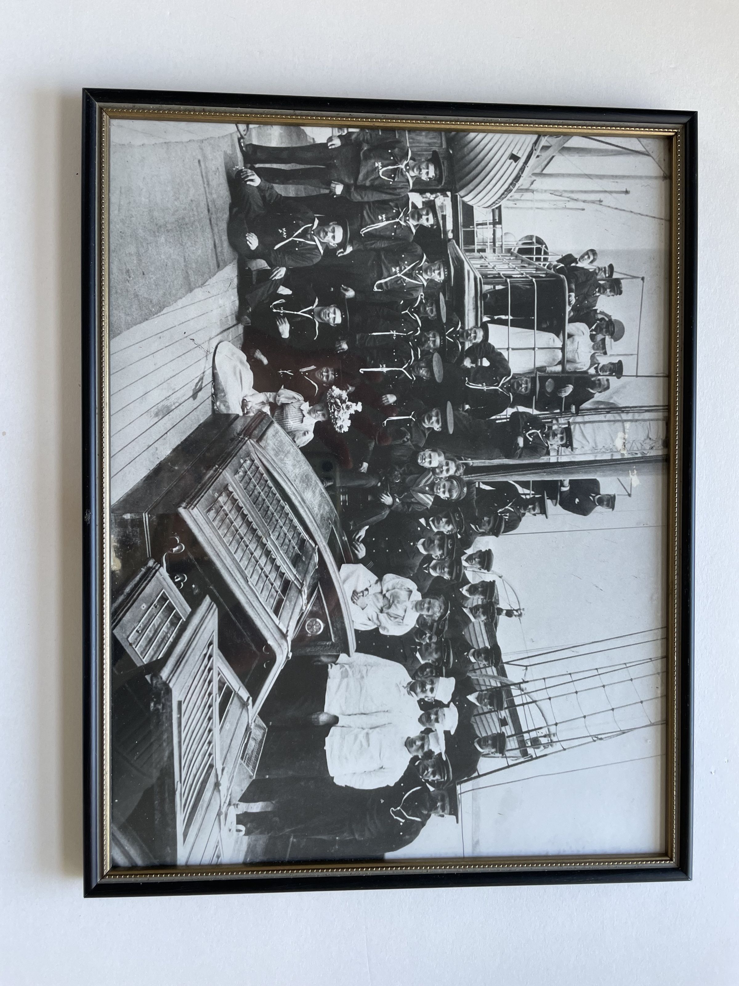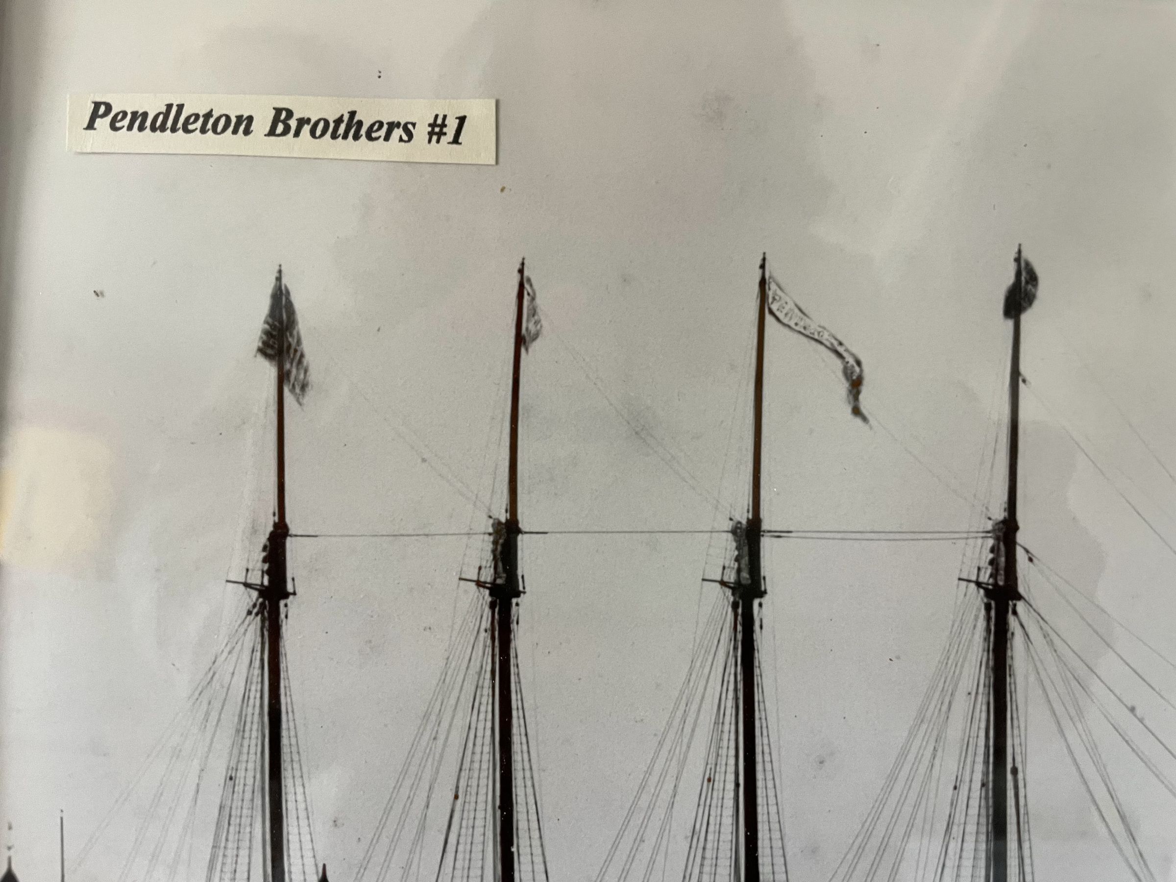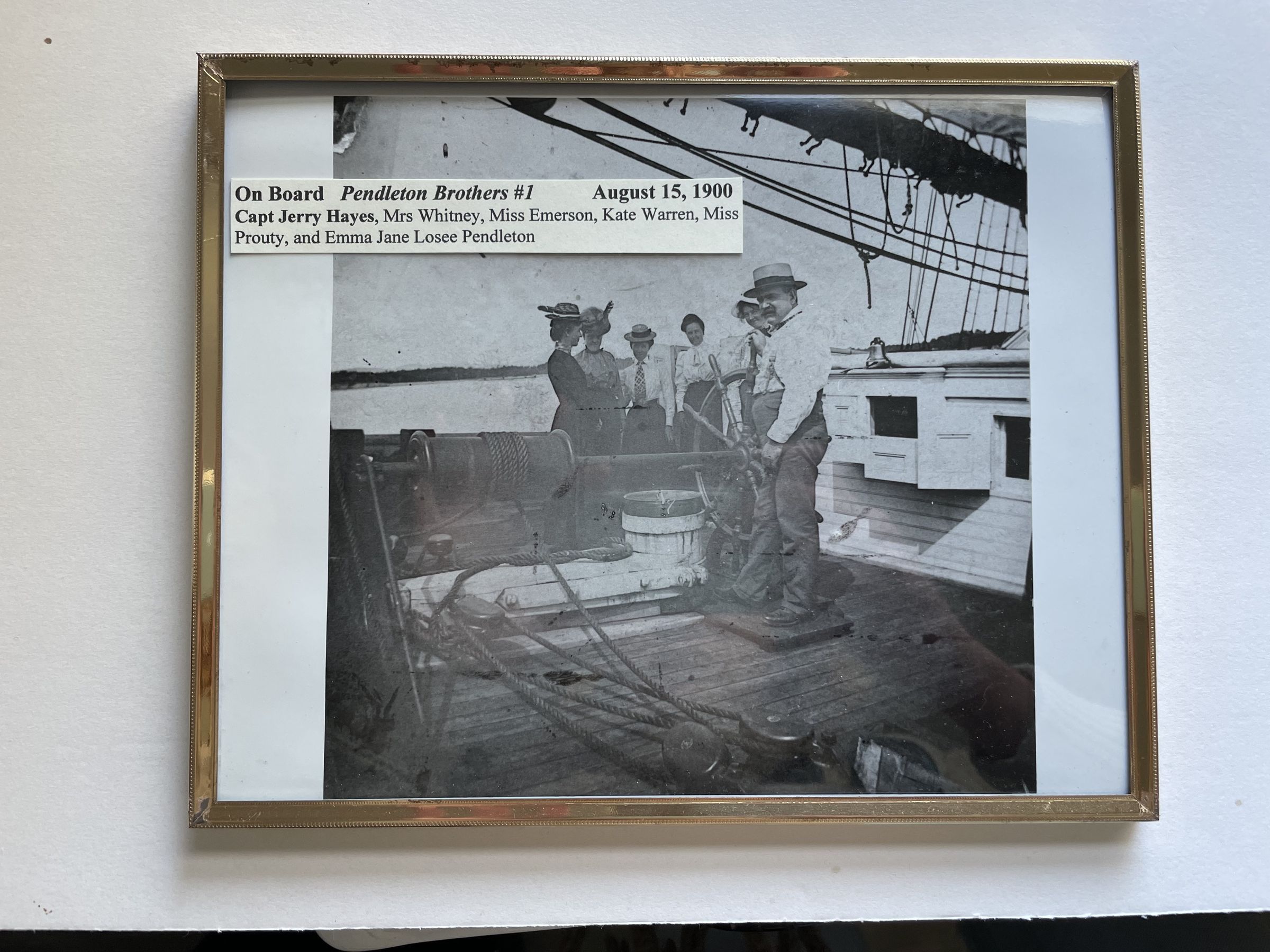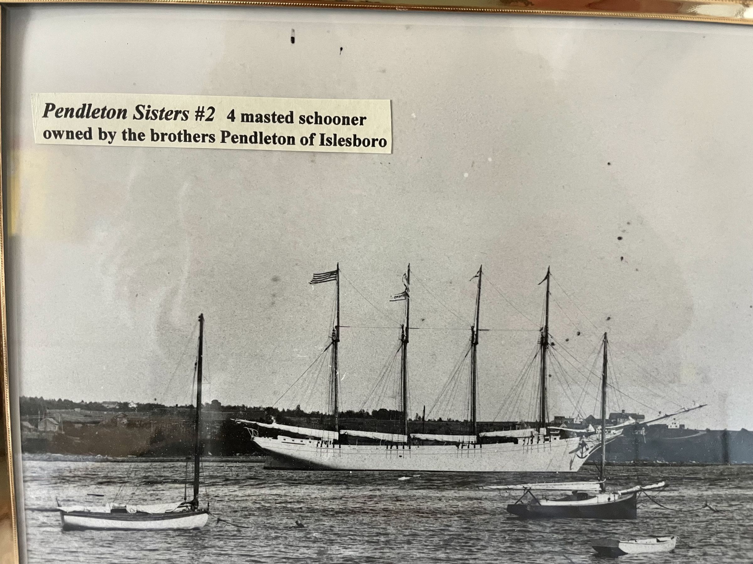 Images of schooners owned by the Pendleton brothers on Islesboro. Both images are in black and white and framed in metal gold coated frames.