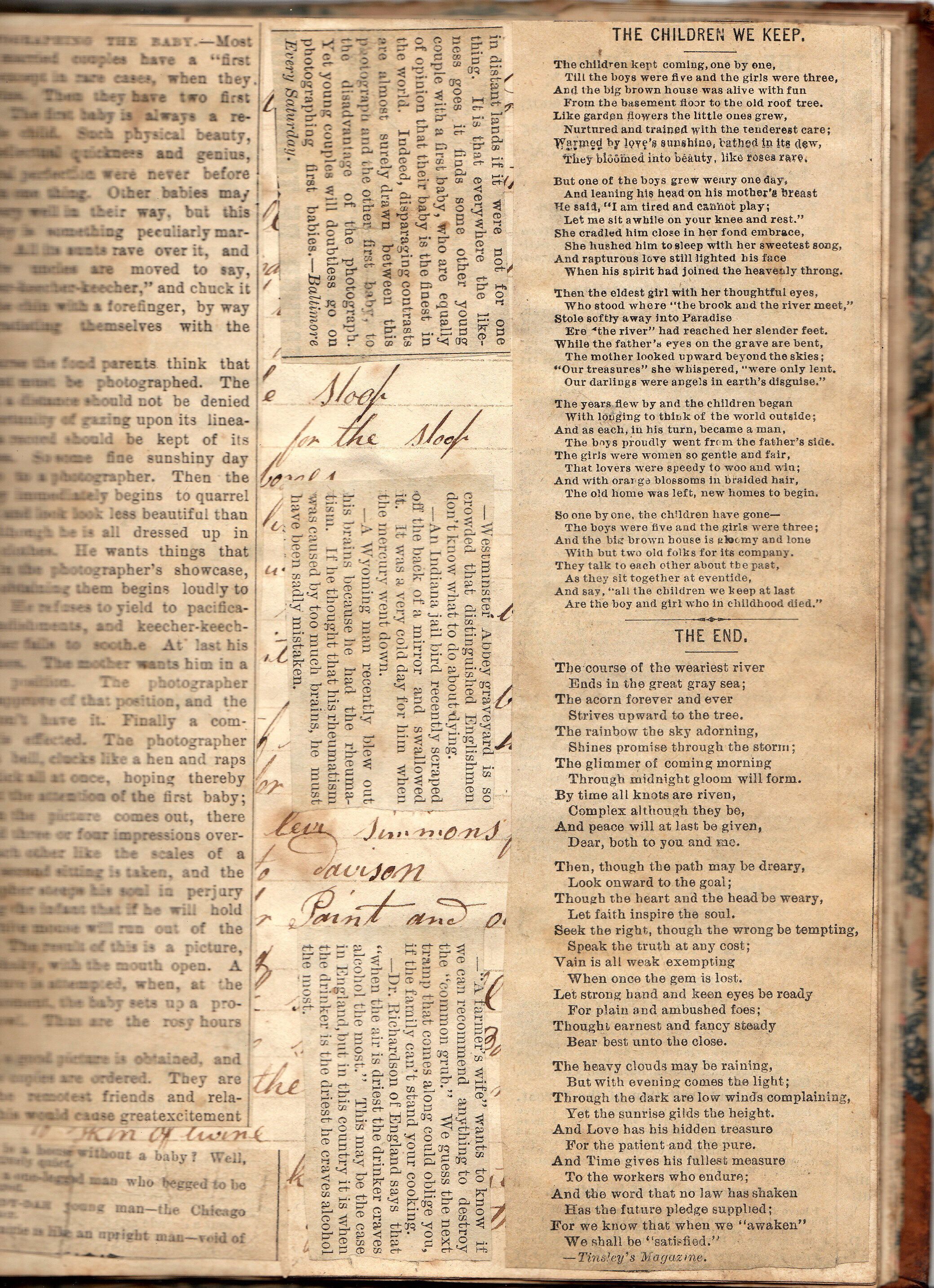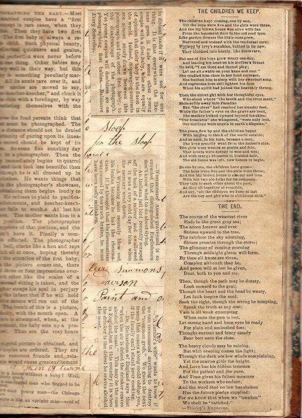 Scrapbook, 7 1/2 inches x 9 1/2 inches, marbled cardboard covers, in fair condition. Book contains newspaper clippings, poems and stories, many of them humorous. The book itself appears older than the pasted-in clippings. Pages are lined with writing visible in sepia ink--perhaps orignially a ship's log or workbook of the same period as the 19th-century Trim workbooks and records (2015.026.024, 2015.026.025, 2015.026.026, 2015.026.027).
