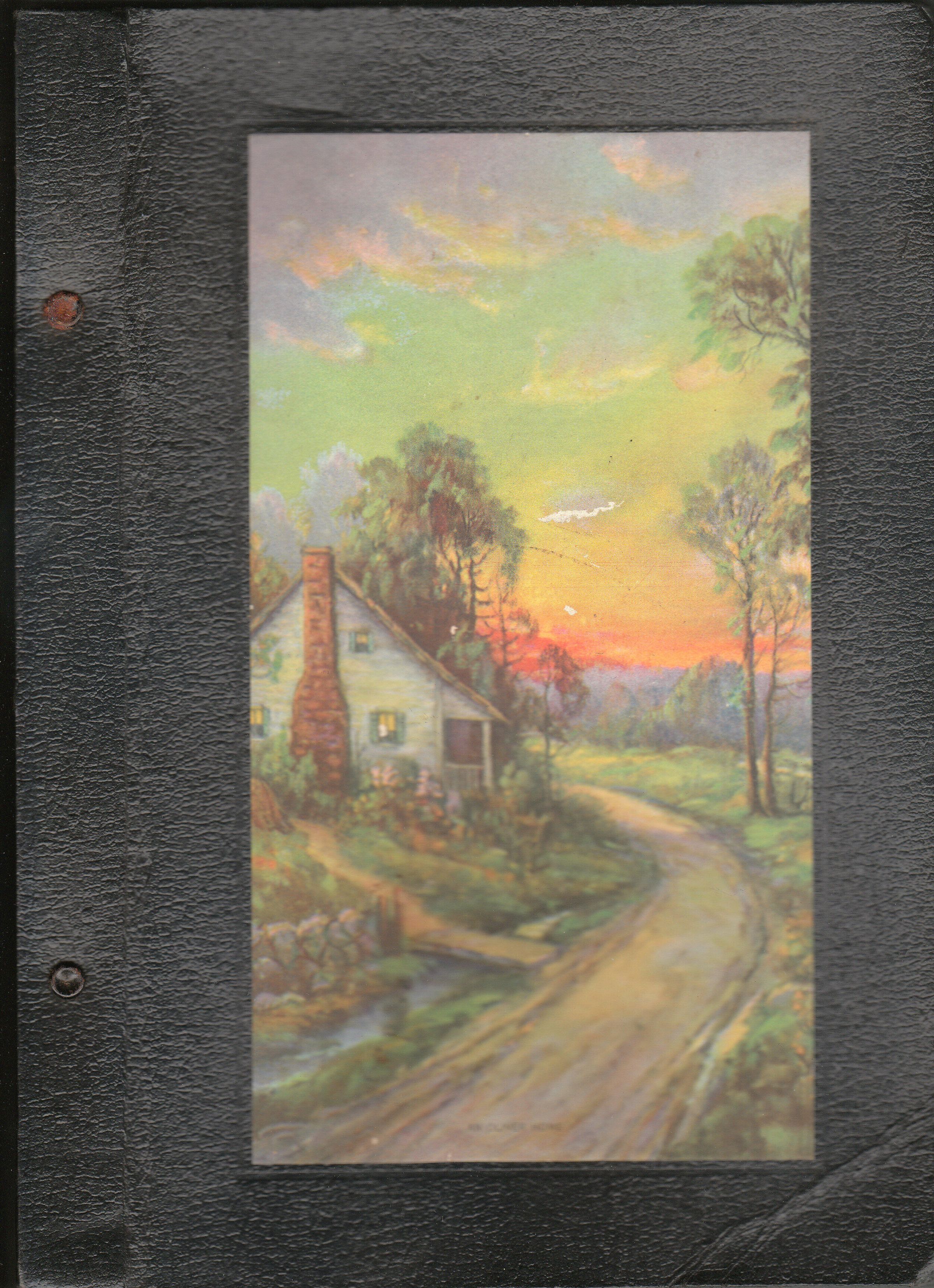 Scrapbook, black cardboard, 8 1/2 inches x 11 1/2 inches, color print of a country house at sunset pasted on front cover with the caption "An Oliver Home." Inside are newspaper clippings of obituaries of a great variety of people with Islesboro connections. List of names (not comprehensive) include Trim, Trimm, Upham, Decker, Warren, Gilkey, Small, Parsons, Pendleton, Dodge. Some loose clippings in tissue paper inserted at the back.