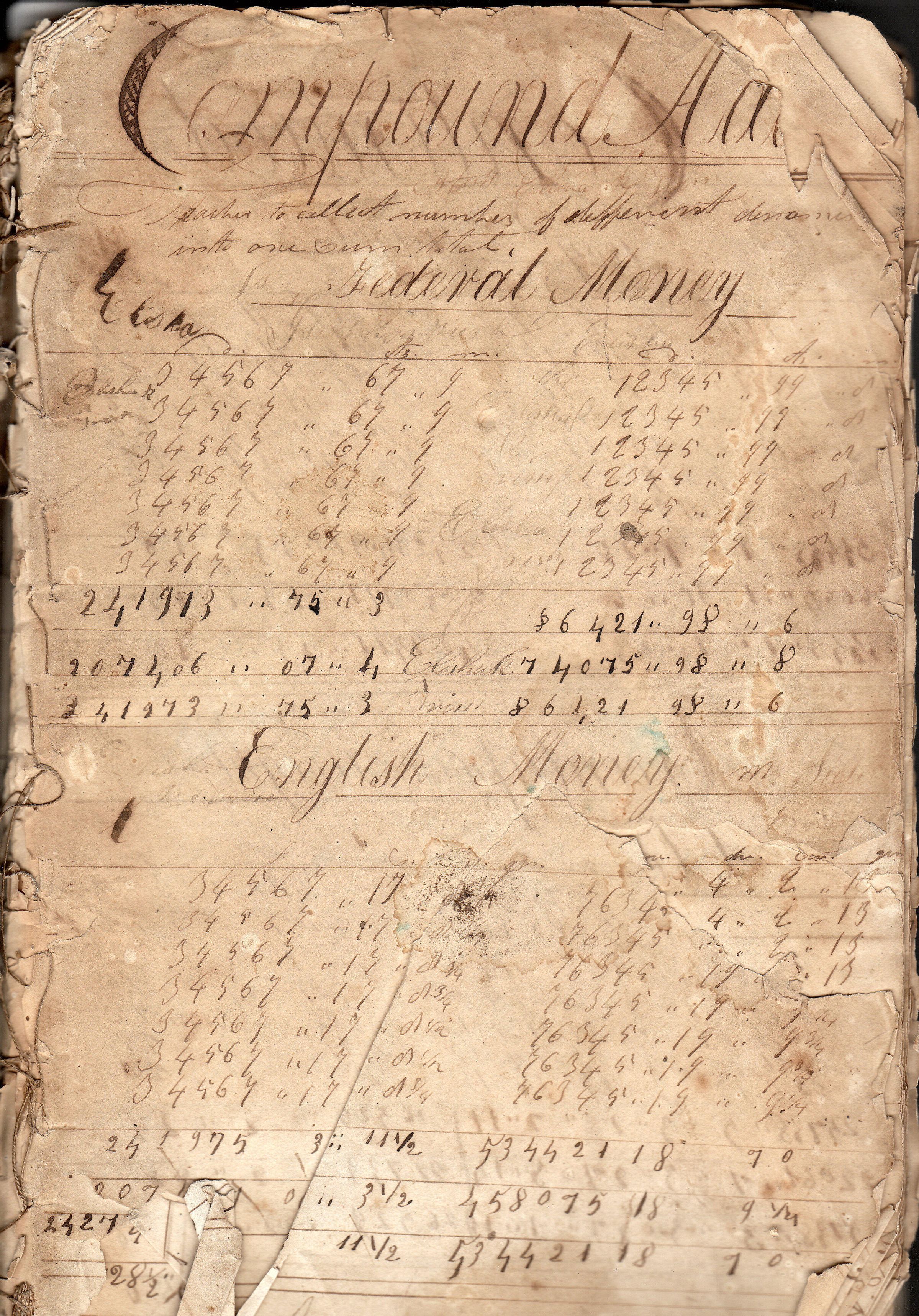 Handsewn mathematical workbook in fragile condition, 8 inches by 12 inches.Covers a range of subjects, including currency, navigation, time, compound and simple interest, weights and measure, basic math rules, geometry, and the like. Book still has its back cover, of marbled paper. The inside back cover includes various notations: