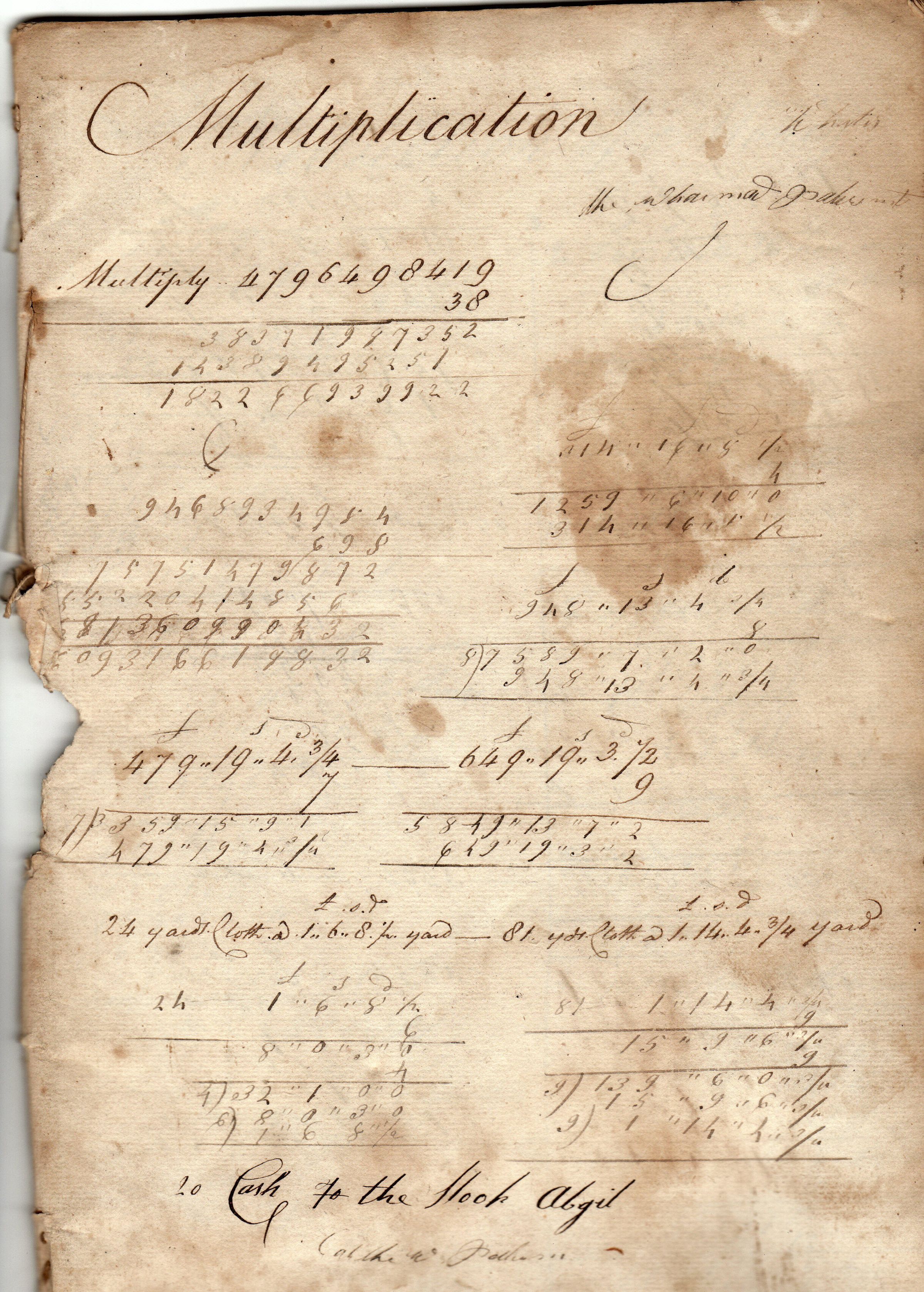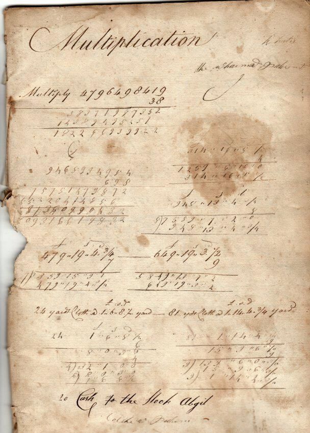 Handsewn mathematical workbook in fragile condition, 8 inches x 12 1/2 inches, covers missing, final page a shredded scrap. Book covers a range of subjects, including time, interest, weights and measure, basic math rules, gauging, and the like. Lacks the wonderful doodling of its companion workbook (2015.026.024). Back pages include what looks like a draft of a letter home: "I write to let you [k]now I am in good health and expect toe return home as soon as posebell."