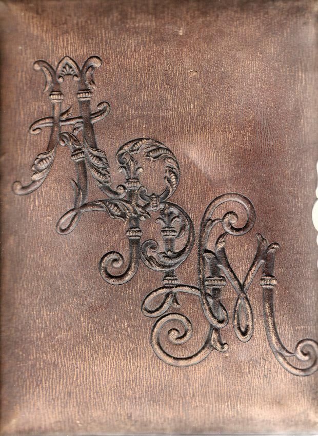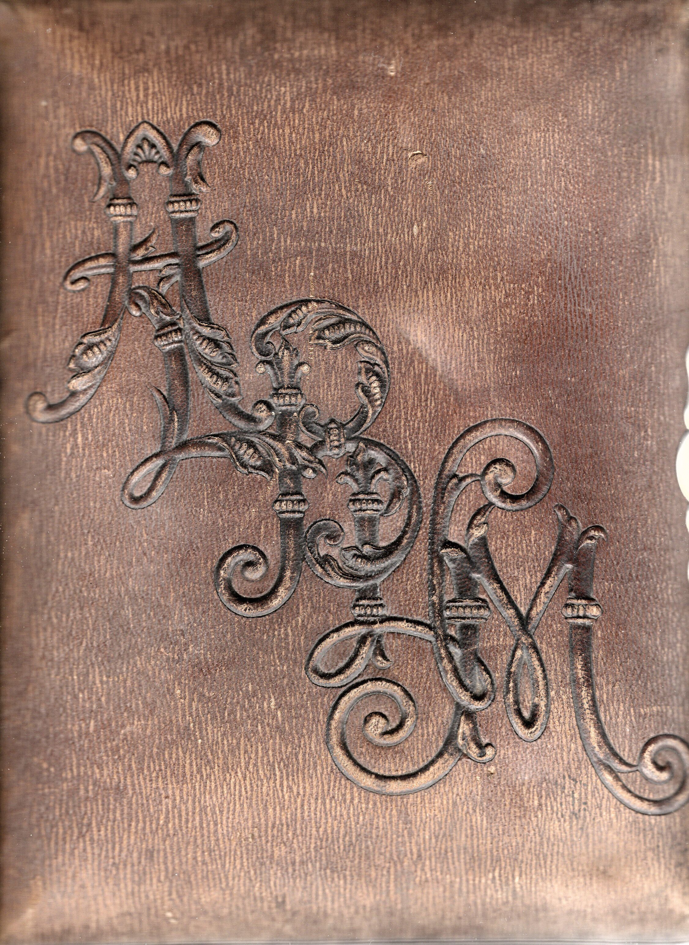 Thick leather photograph album, 8 inches x 10 1/ inches x 2 inches, binding torn and broken; on front of album part of a broken metal clasp remains. Elaborate scrolled initials HBM (ABM?) embossed on front cover. Album contains cabinet cards, posed studio photos, and amateur photos of various sizes, some loose from their paper frames; small tintypes in the back pages. Advertisement for the Twenty-Sixthy Annual Session of the Temple Heights Spiritualist Camp Meeting in Northport , Maine (1908; 2015.026.029) inserted inside the front cover.