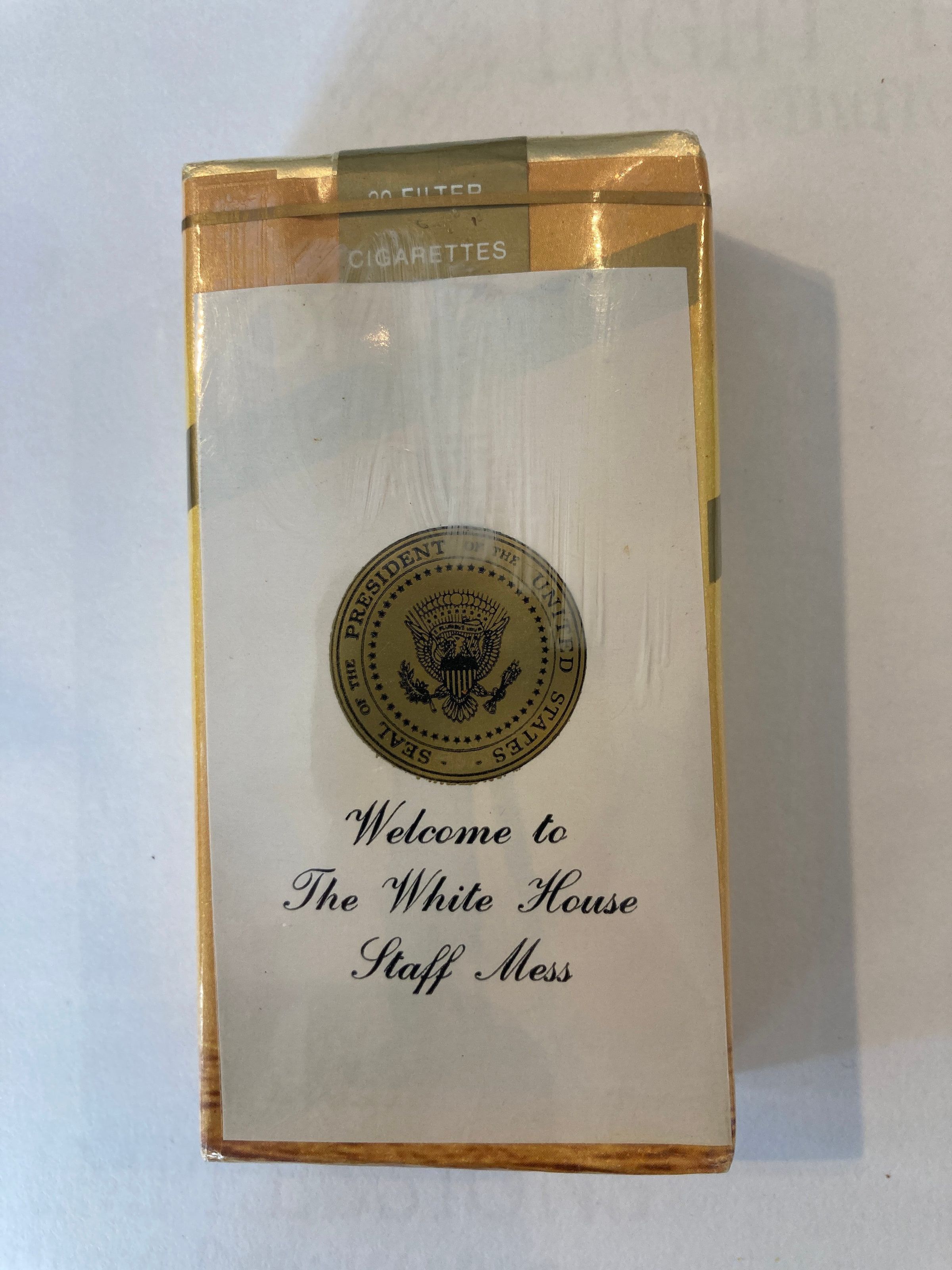 An unopened soft pack of Chesterfield 101 Cigarettes bearing the Presidential Seal. Measures 4 inches length, 2 1/4 inches width, 7/8 inch height.
