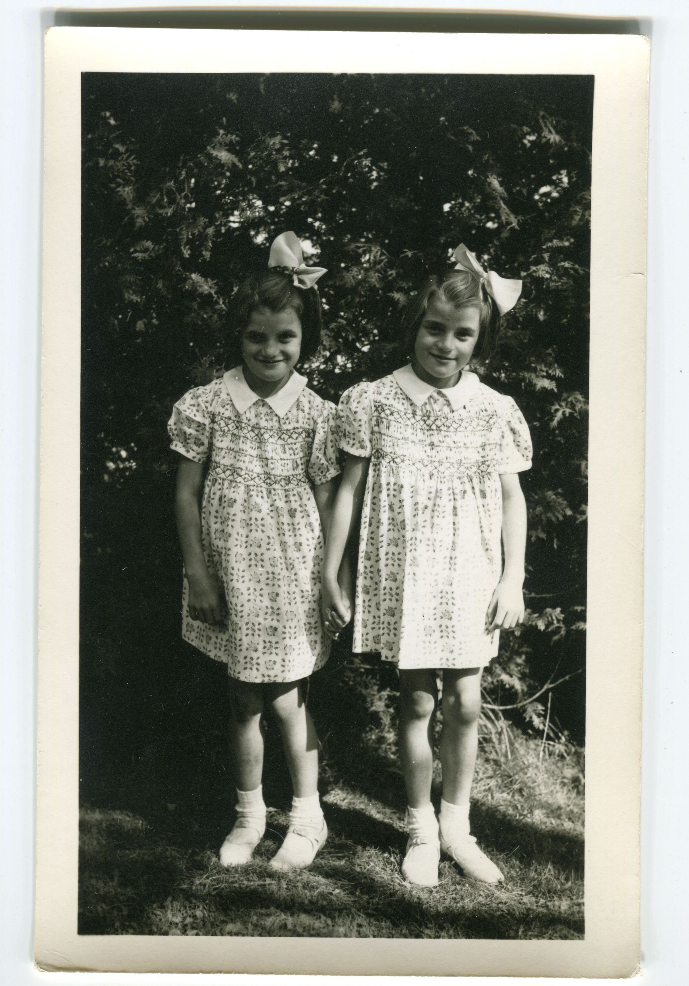 Photo of two girls (twins?) in matching smocked dresses, bows, ankle socks, and white Mary Janes. Identified, but not by first name, on the back: "Shirley Pendletons two little girls."