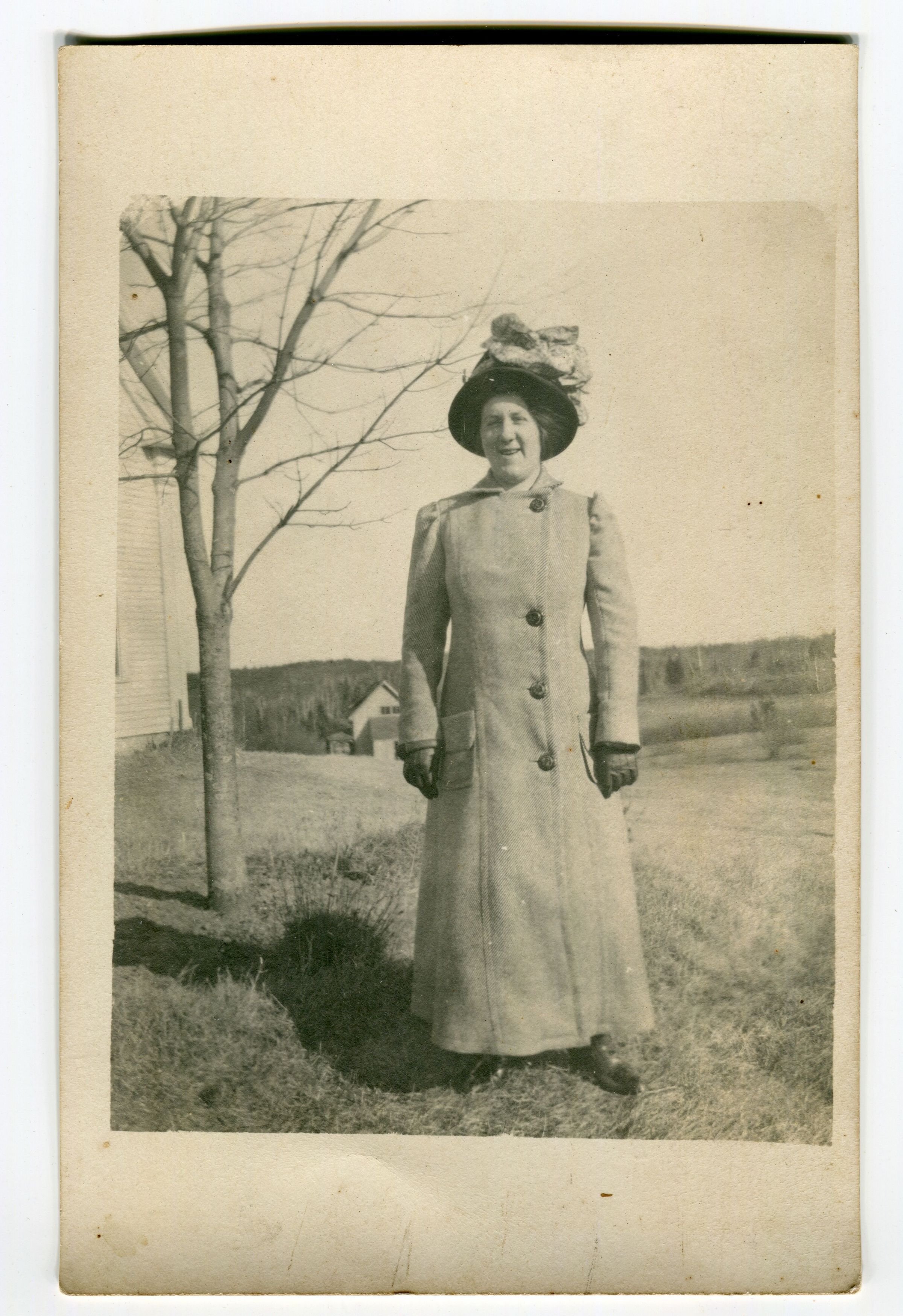 Duplicate photos of Stella Scott Steele standing outside in a long coat and elaborate hat.