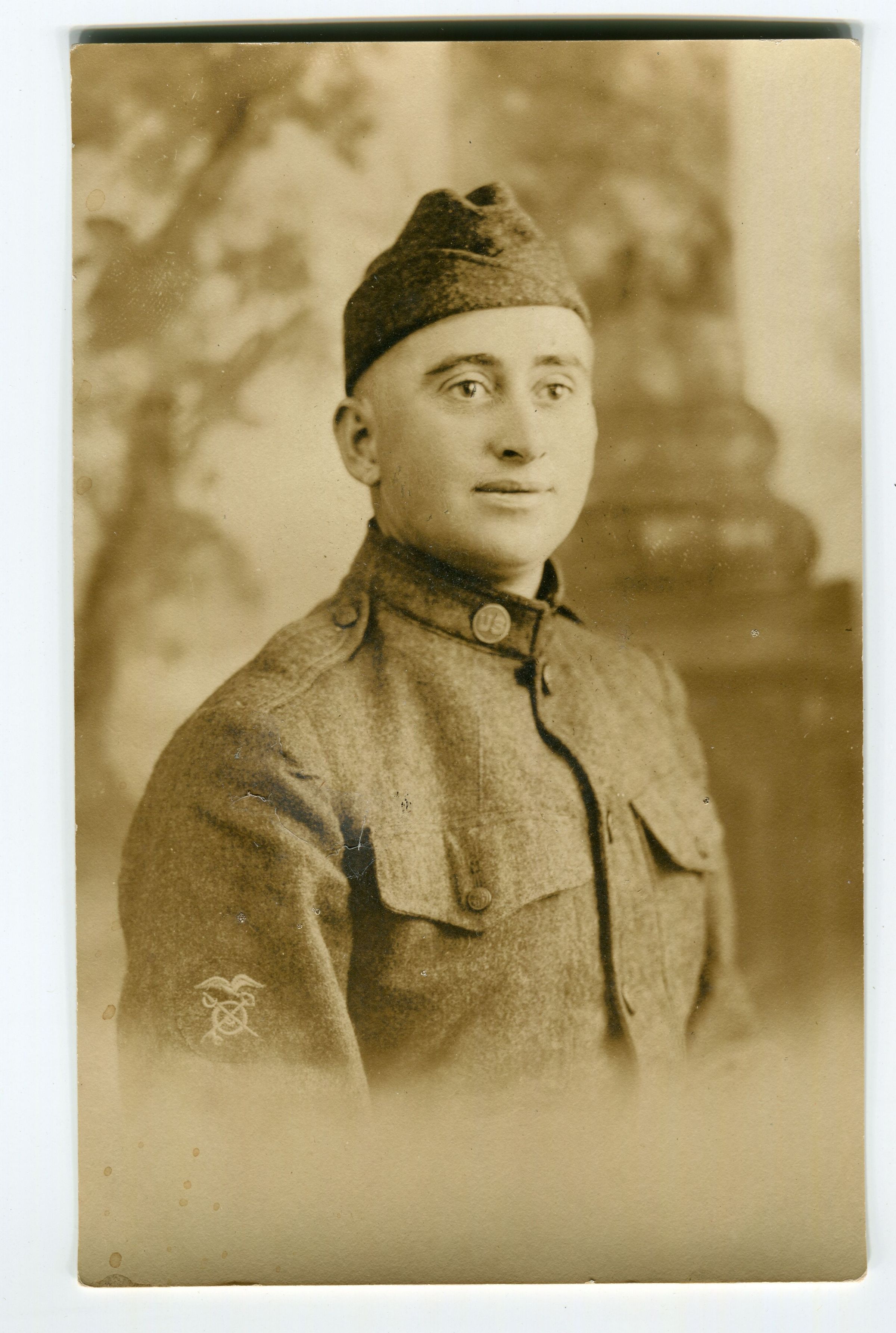 Studio portrait postcard of George W. Dodge in uniform (WWI). Insignia visible on right sleeve: Quartermaster Corps?--crossed sword and key through a circle under an eagle (see notes).