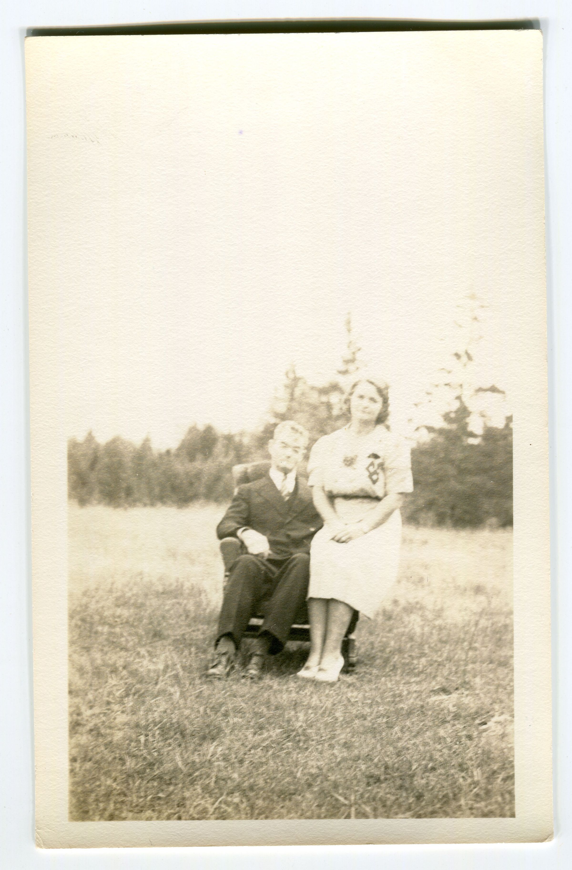 Man and woman posed in an armchair in a field. 1940s attire? Identified on the back: "Mr & Mrs Robertson, up island, Islesboro, Me."