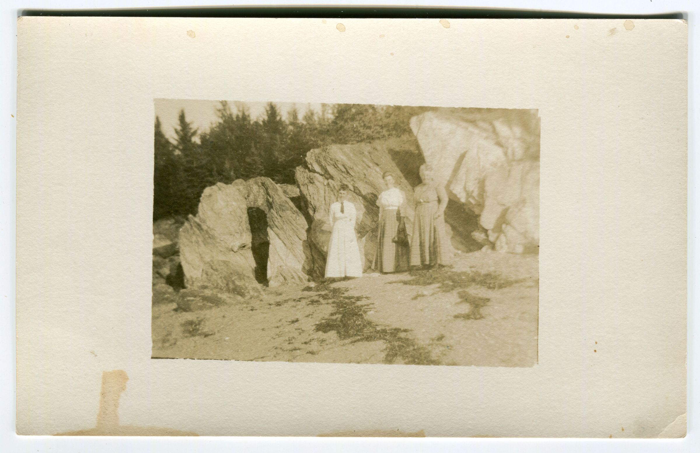 Duplicate photos of three women on the shore at "Hughs Pt" [Hewes Point]. Indentifed on the back of each: