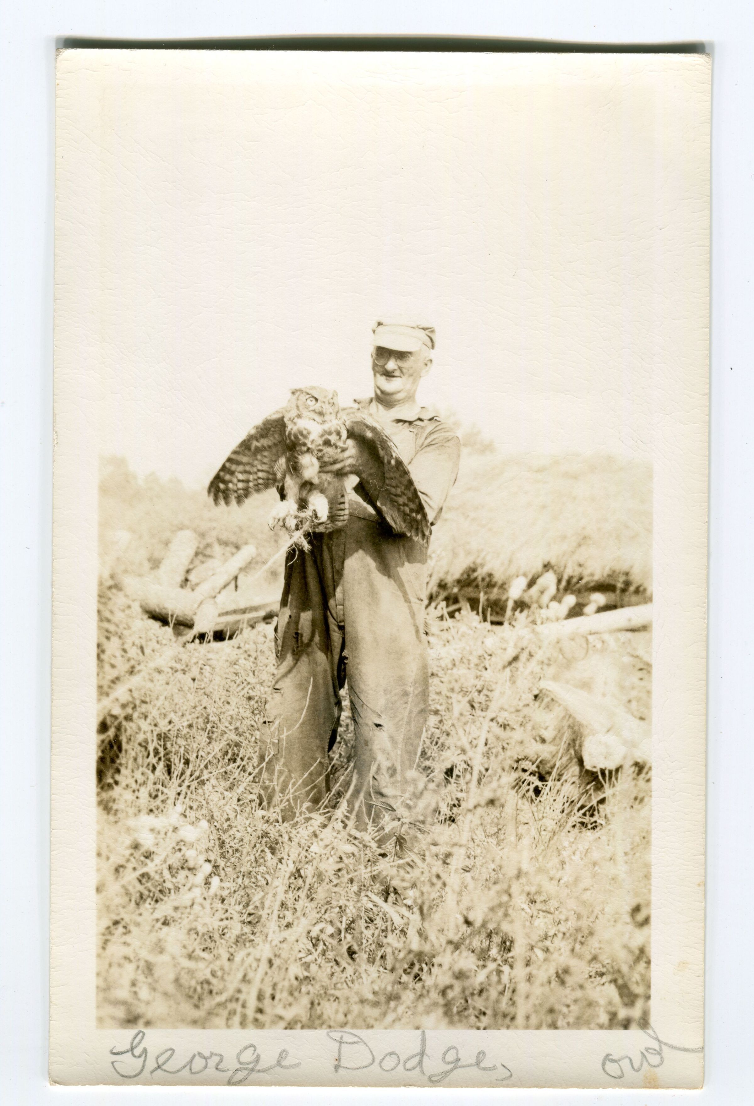 George Dodge in a field holding up a large owl for the camera. Owl not identified. Northern Hawk Owl?